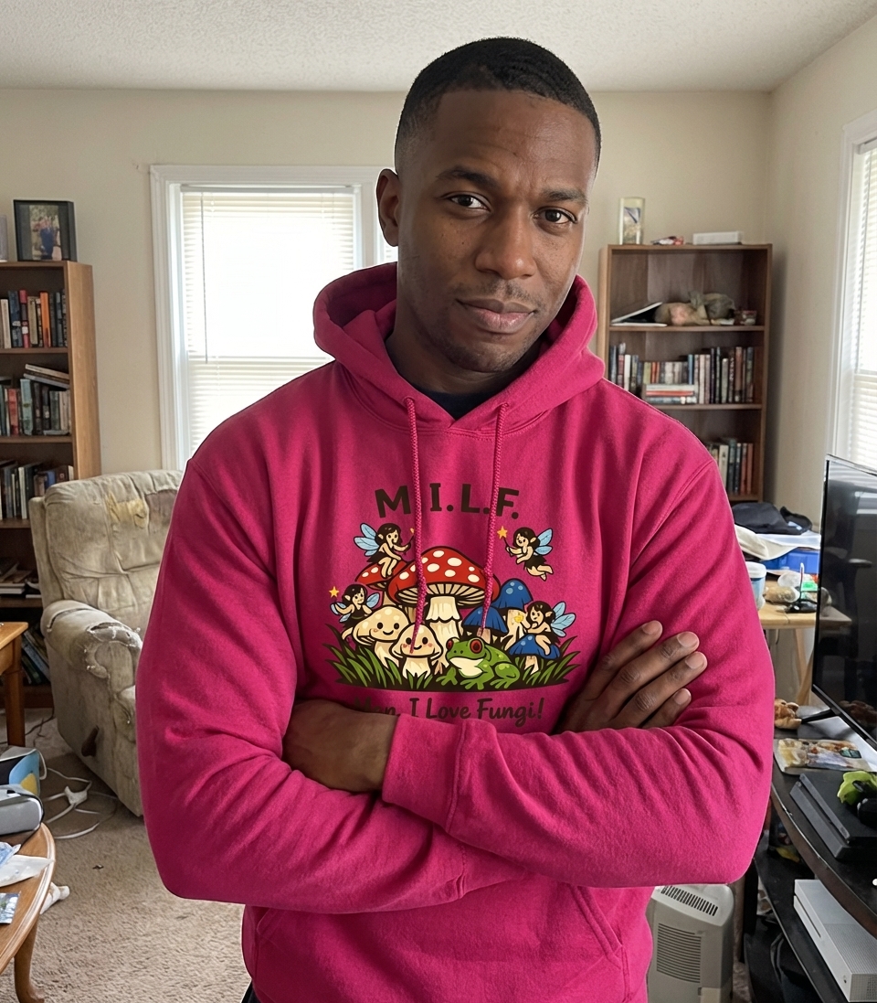 The design cleverly plays on the popular acronym 'M.I.L.F.' by humorously reinterpreting it as 'Man, I Love Fungi!'. This witty wordplay offers an unexpected and innocent twist, appealing to those with a playful sense of humor and a genuine appreciation for the fungal kingdom.