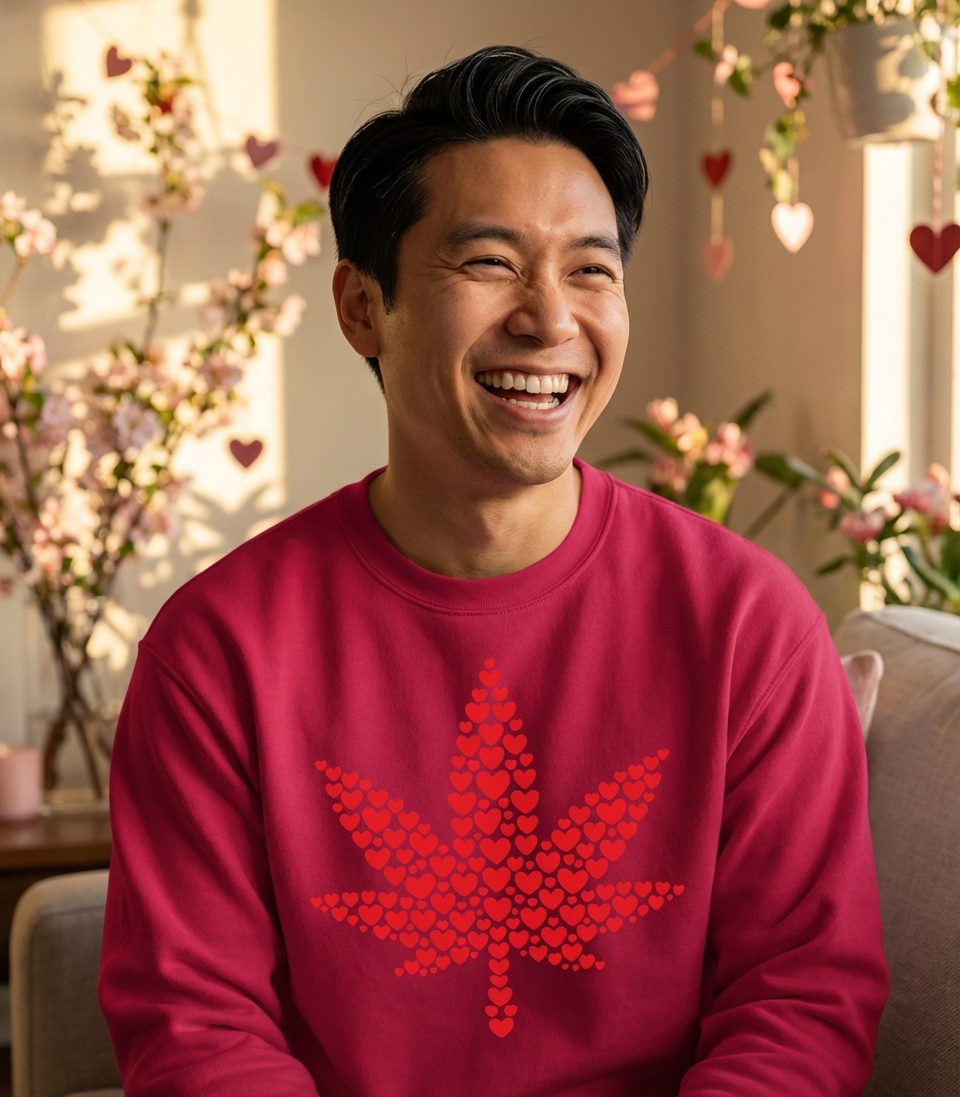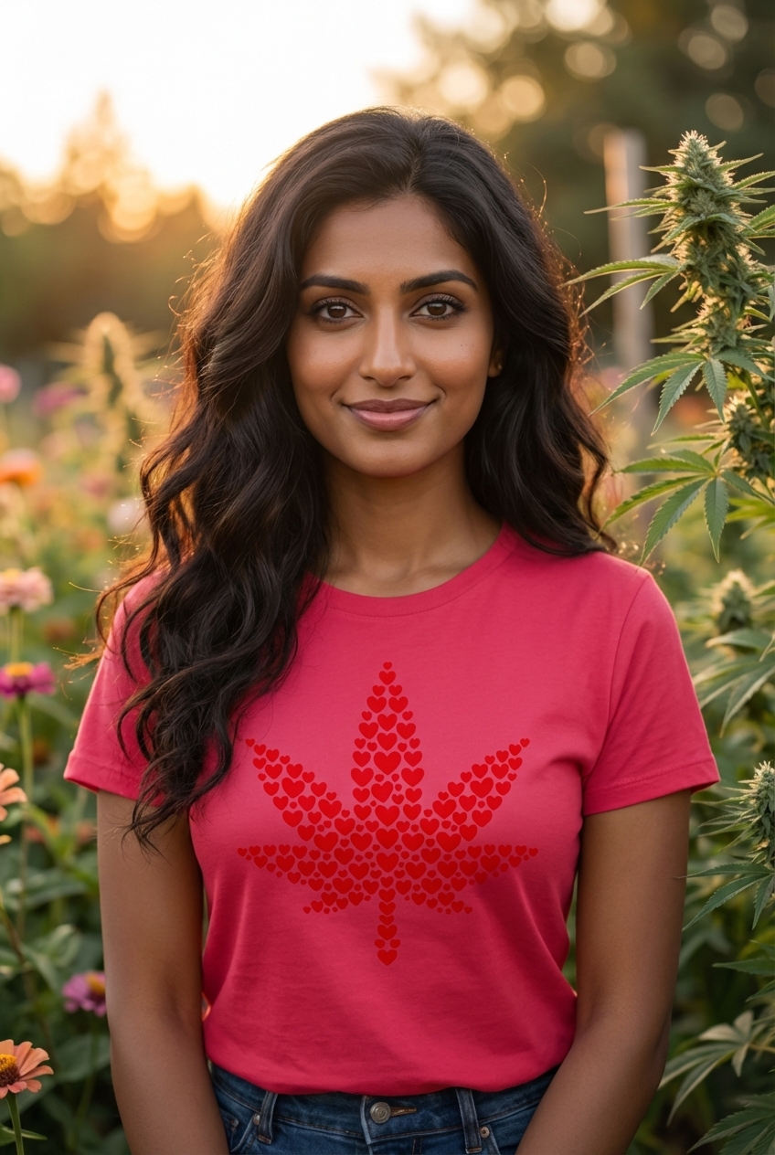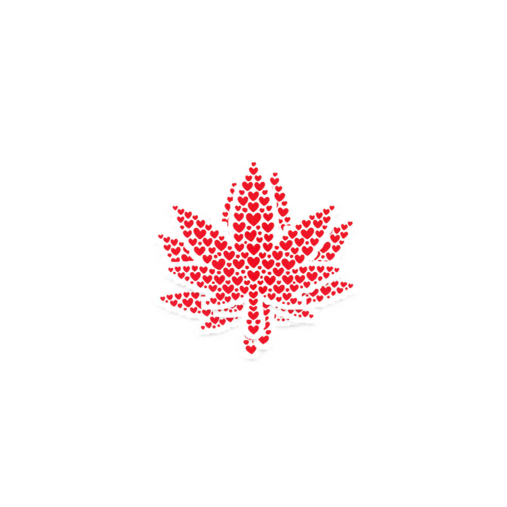 This striking graphic features the iconic silhouette of a cannabis leaf, artfully constructed from a multitude of small, vibrant red hearts. The design is set against a stark black background, making the red hearts pop and creating a bold visual statement.