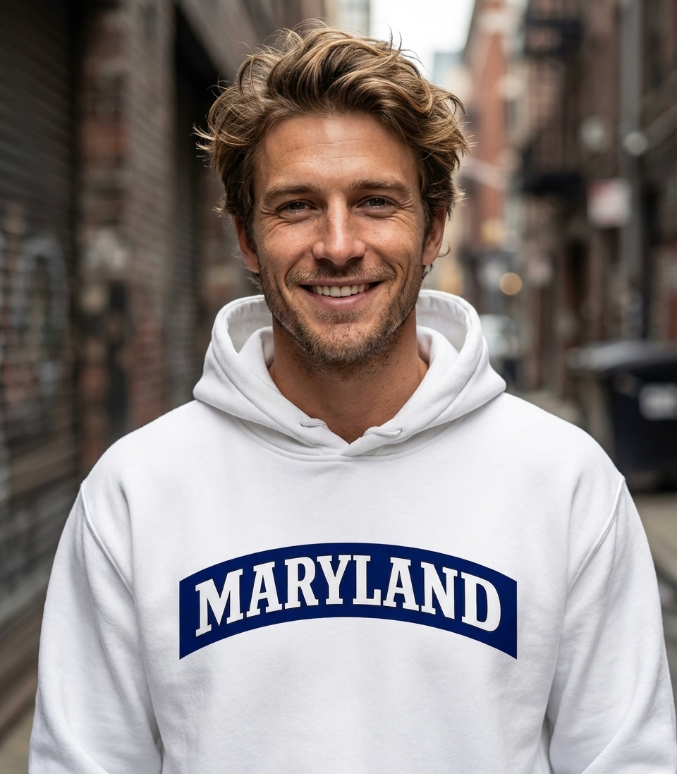 The 'MARYLAND' design captures the spirit of passionate residents who celebrate their state, cherish its history, and proudly display their local identity.