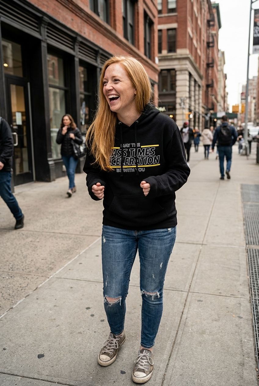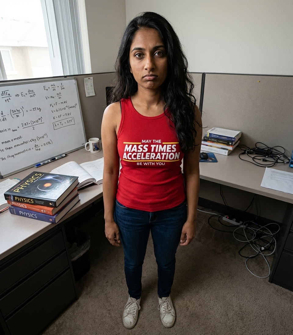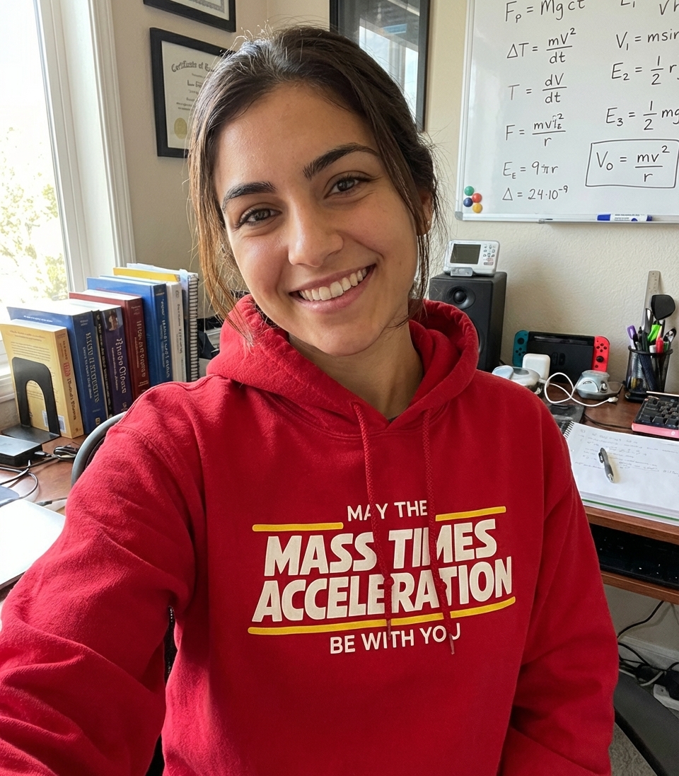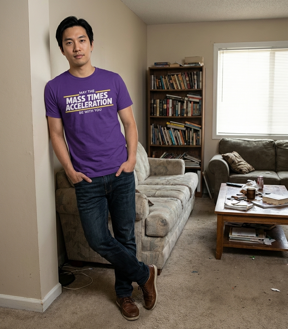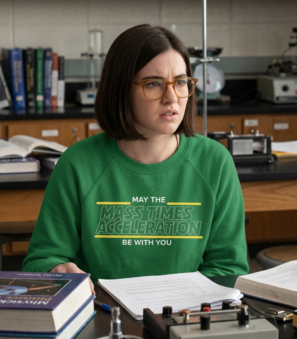 The "May the Mass Times Acceleration" phrase captures the lifestyle of clever science enthusiasts who enjoy physics, sci-fi references, and witty humor.