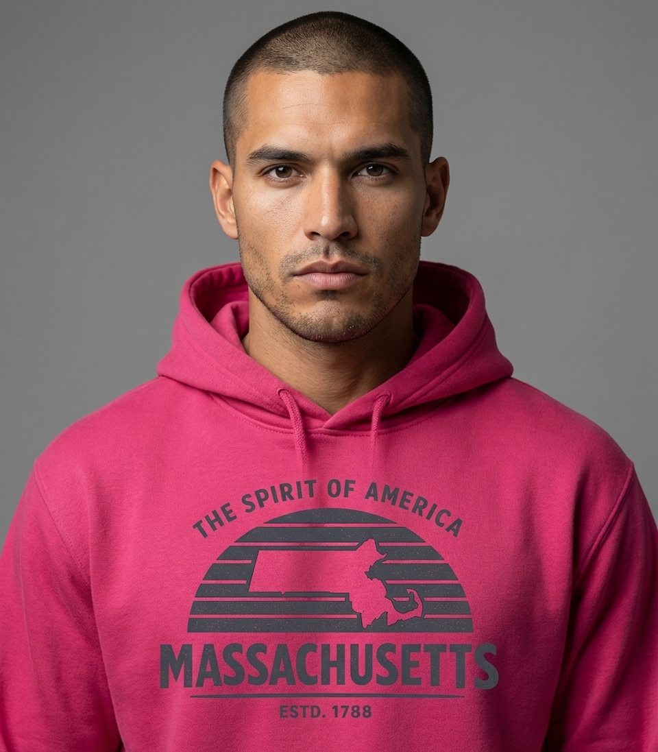 "The Spirit of America" refers to Massachusetts' historical significance in the founding and development of the United States. "ESTD. 1788" marks the year Massachusetts ratified the U.S. Constitution, becoming the sixth state. This phrase and date celebrate the state's deep roots in American democracy and independence.