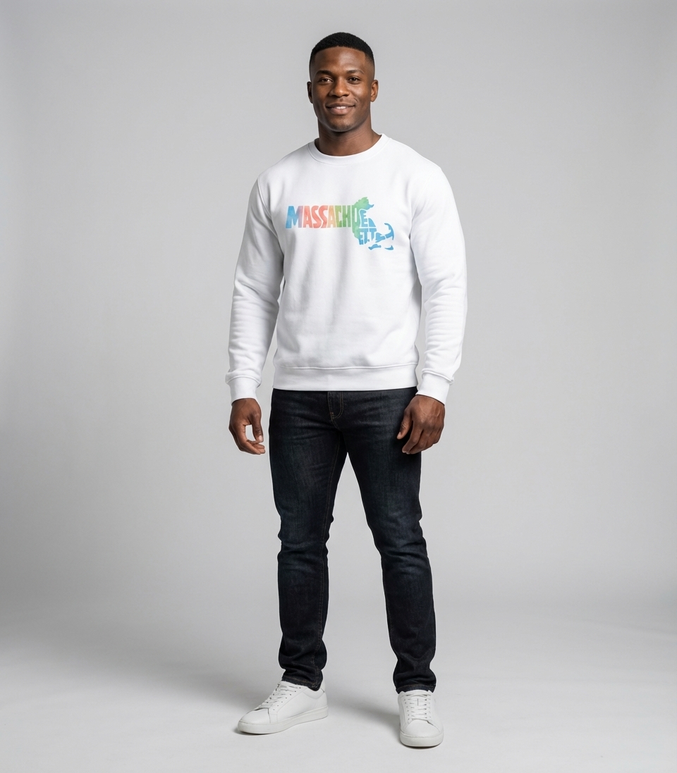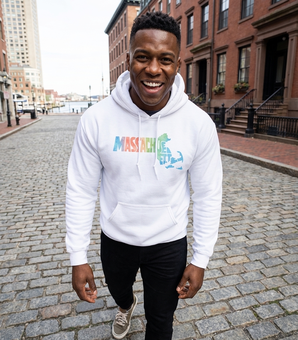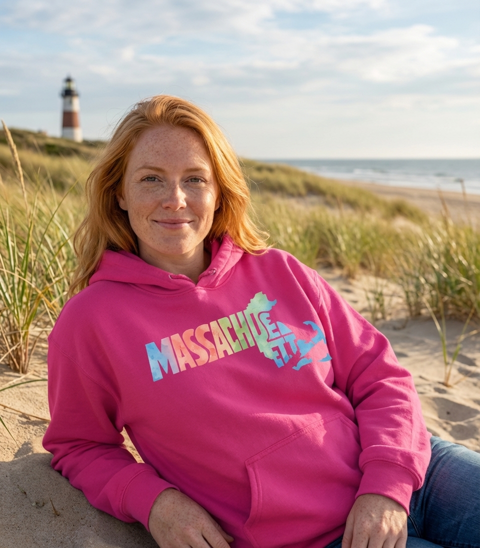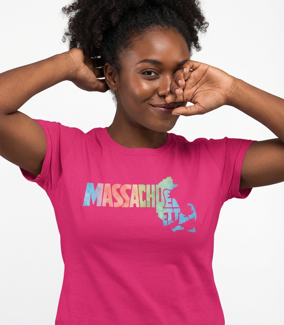 This vibrant design captures the spirit of Massachusetts, celebrating the Bay State's unique shape and identity.