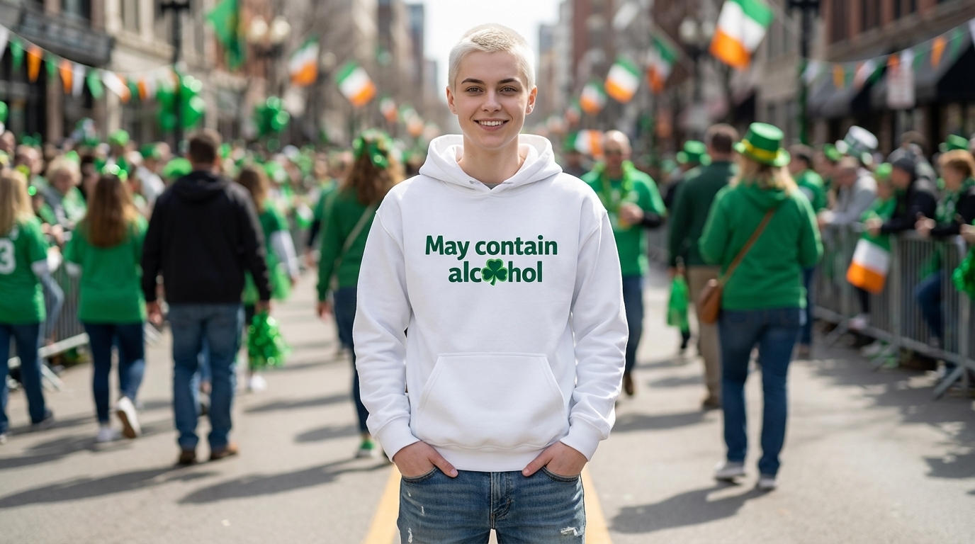 The 'May contain alcohol' phrase humorously captures the festive spirit of St. Patrick's Day enthusiasts who enjoy celebrations, Irish traditions, and a bit of drinking fun.
