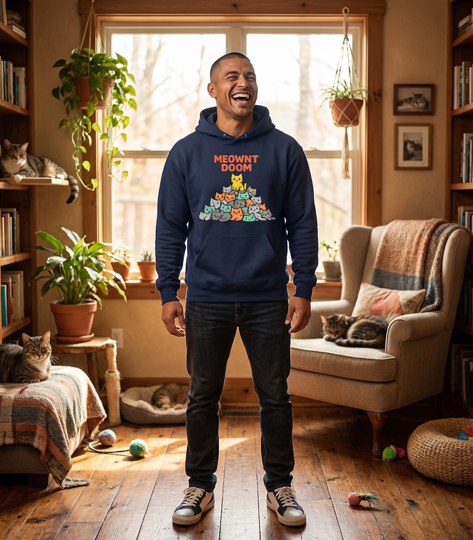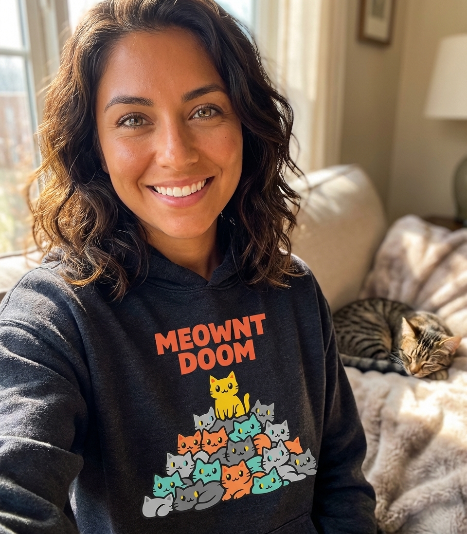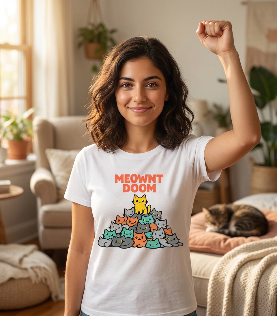 The "Meownt Doom" phrase captures the lifestyle of passionate cat enthusiasts who adore their feline overlords, enjoy playful puns, and appreciate a touch of epic cat-themed humor.