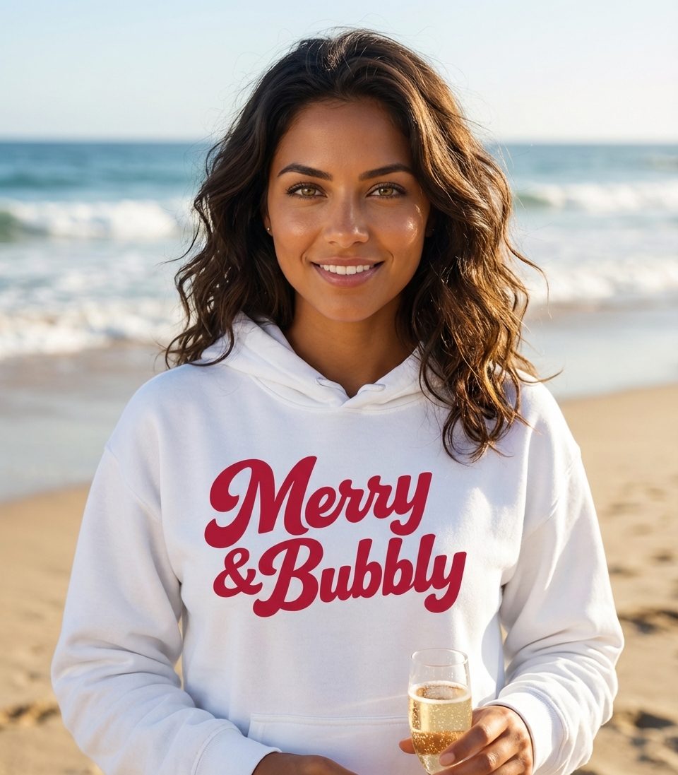 The phrase "Merry & Bubbly" combines the traditional greeting of "Merry Christmas" with the effervescent feeling of joy and sparkling drinks often associated with New Year's Eve and other festive occasions.