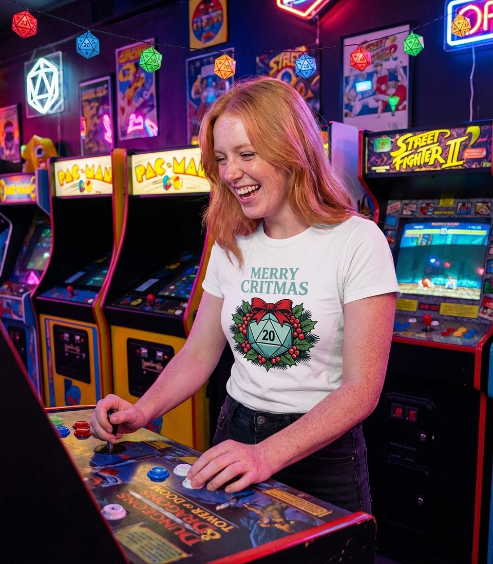 The phrase "MERRY CRITMAS" is a clever pun combining the traditional holiday greeting "Merry Christmas" with "crit," short for "critical hit." In many tabletop RPGs, especially Dungeons & Dragons, rolling a 20 on a 20-sided die (D20) is often a critical success, leading to powerful outcomes.
