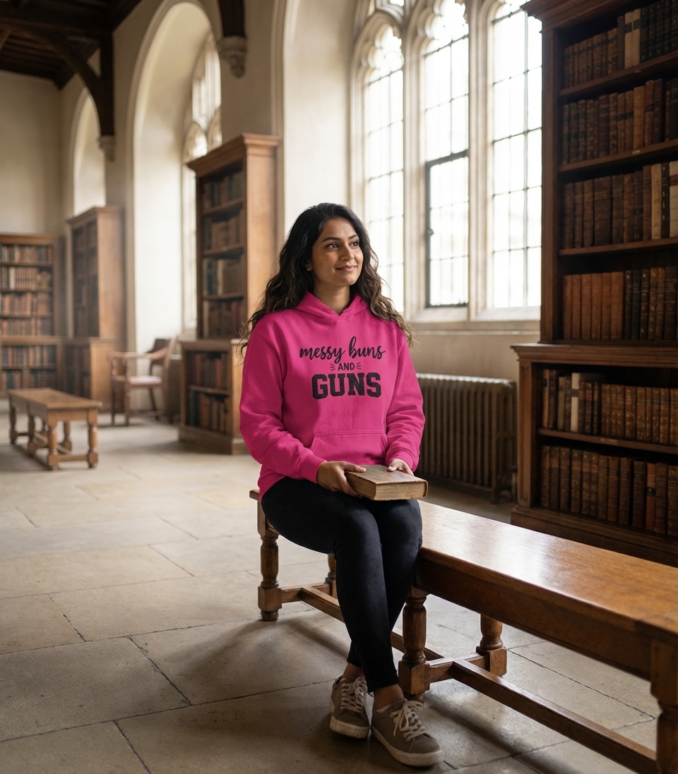 The "Messy Buns and Guns" phrase captures the lifestyle of confident women who embrace their individuality, their love for shooting, and their right to self-expression.