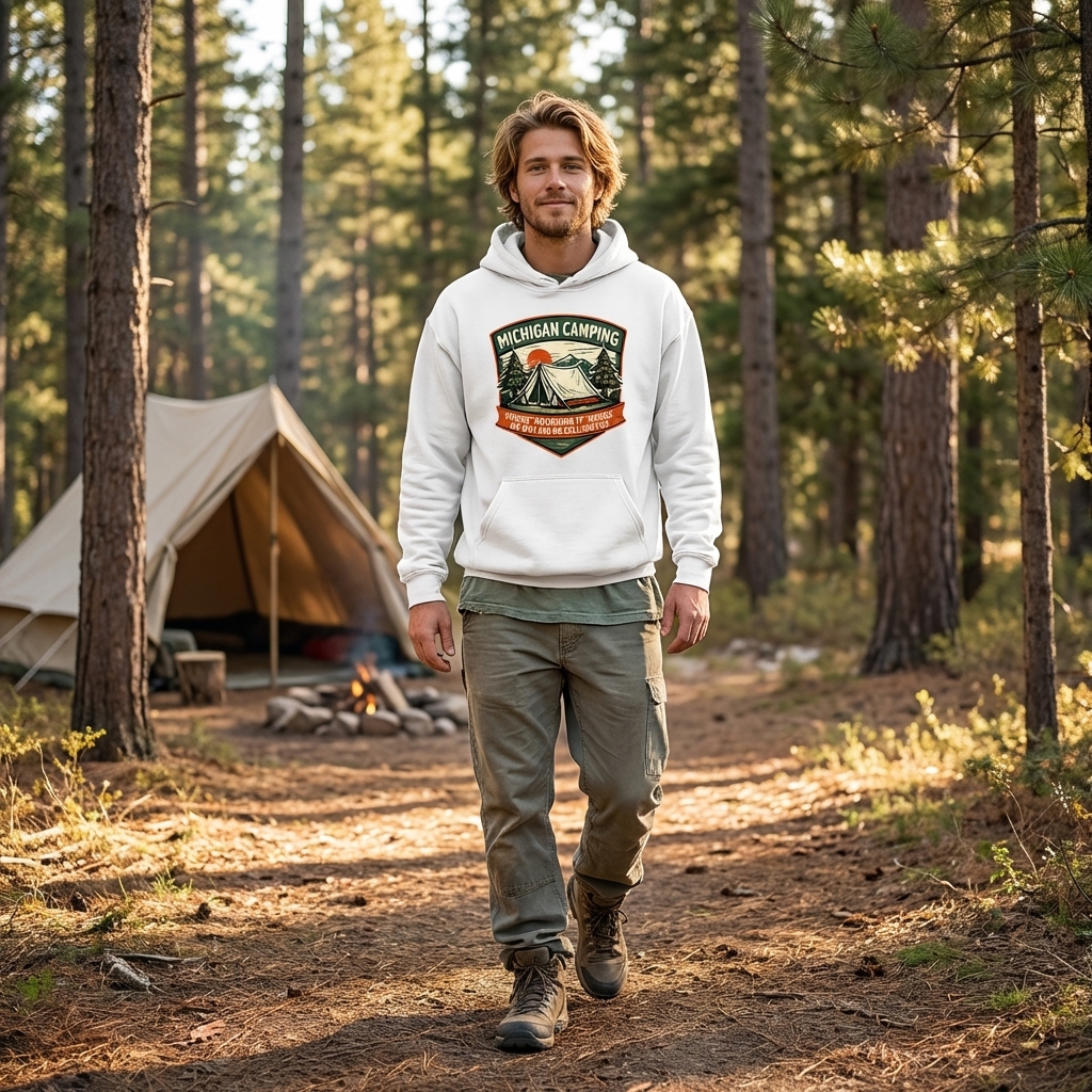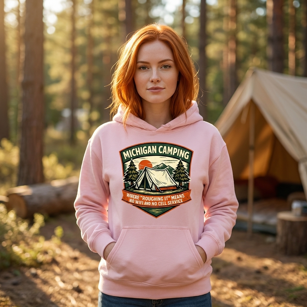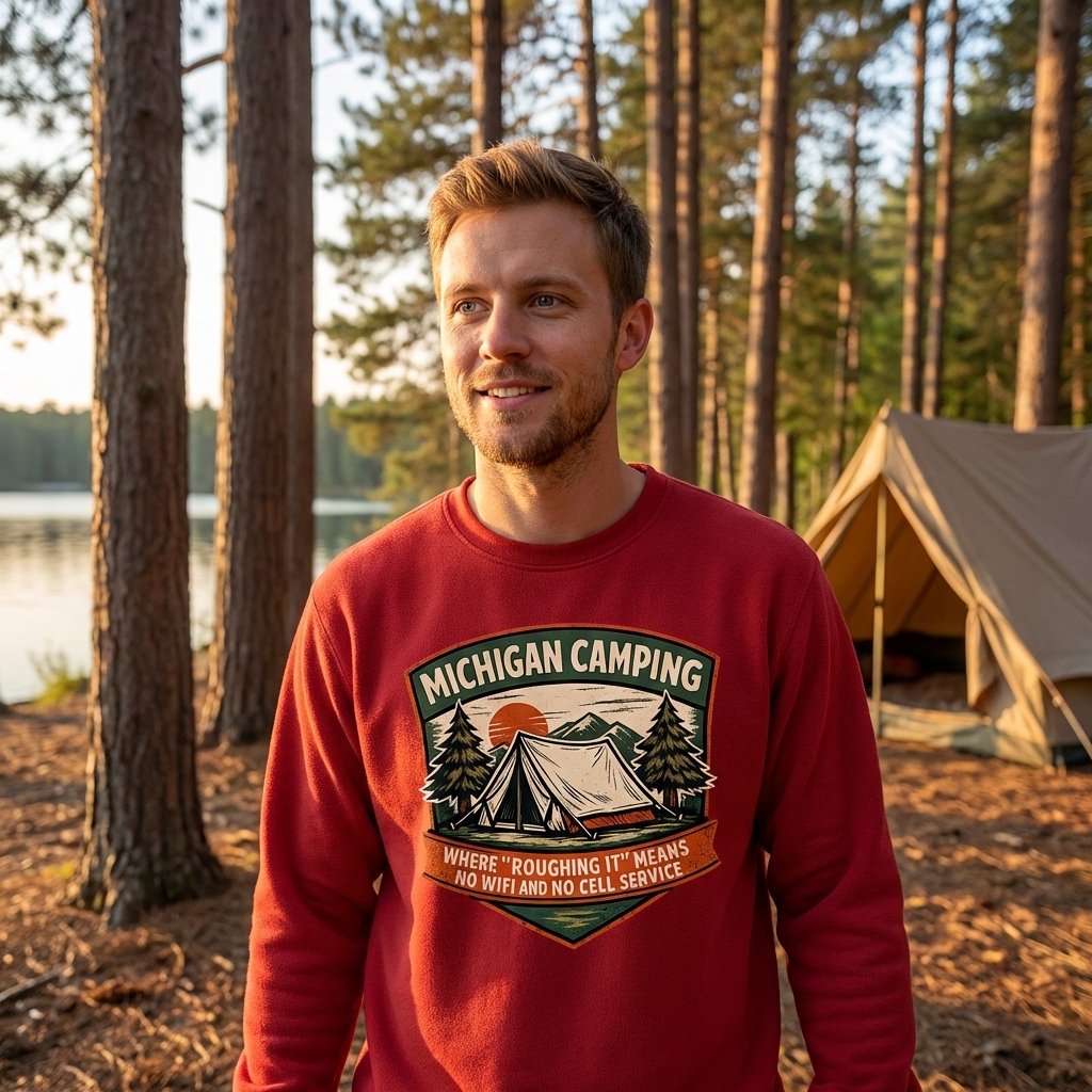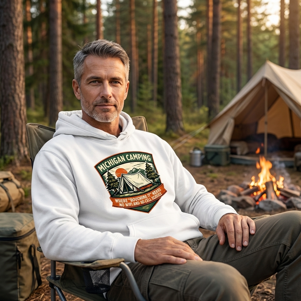 The 'Michigan Camping' phrase captures the lifestyle of passionate outdoor enthusiasts who enjoy unplugging, nature immersion, and humorous takes on modern roughing it.