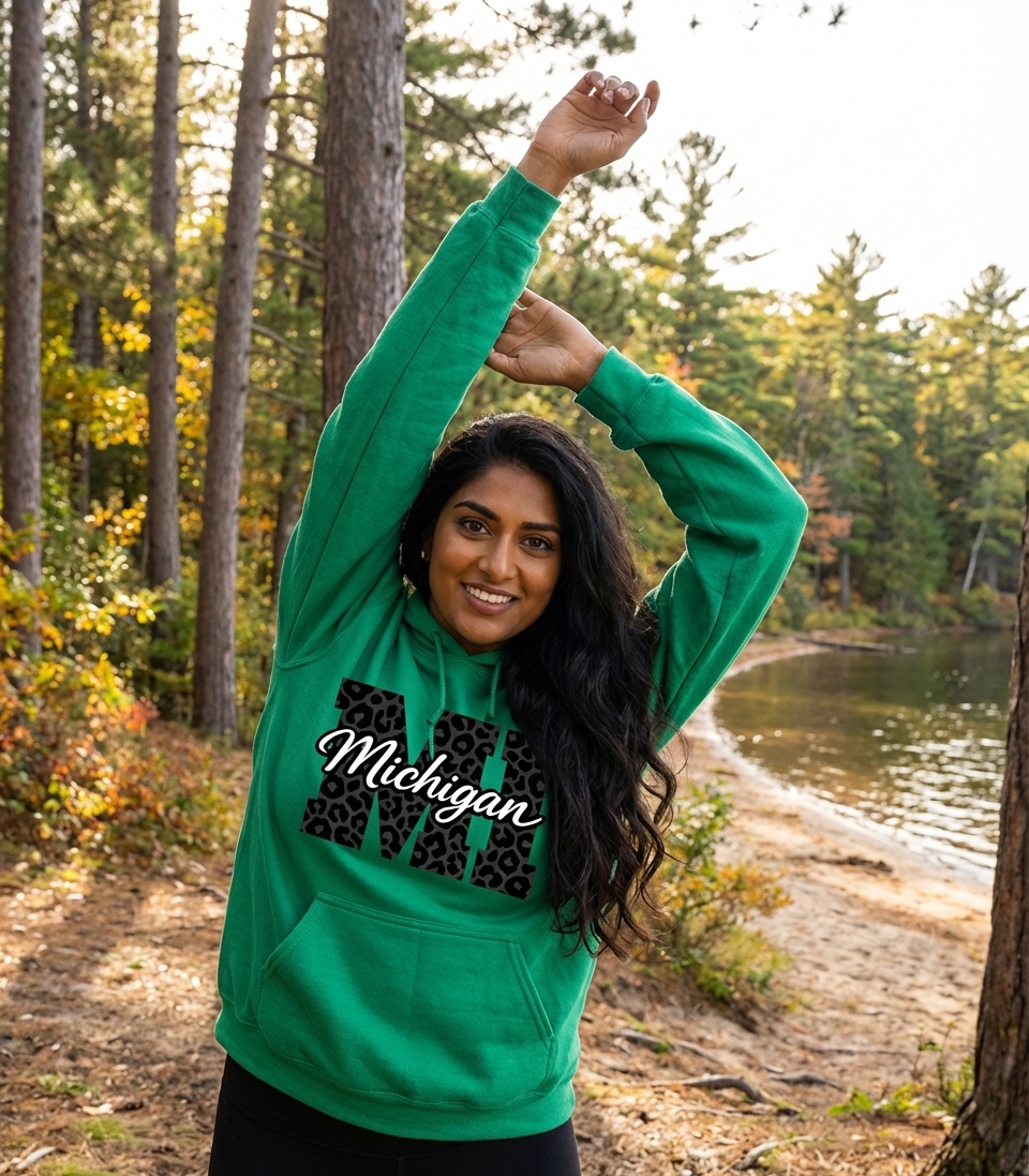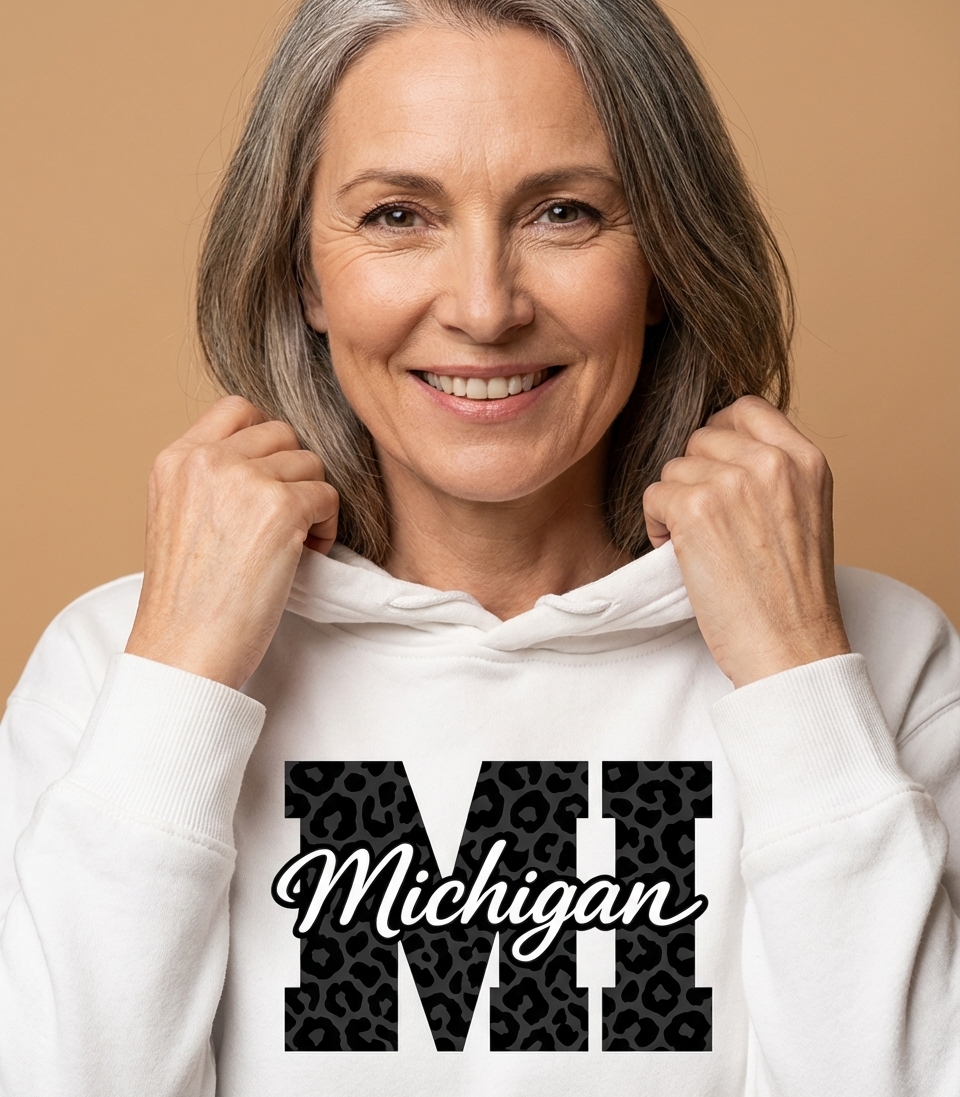 The word "Michigan" represents one of the Great Lakes states, known for its diverse landscapes, vibrant cities, and strong community spirit. This design celebrates being a Michigander, conveying a sense of belonging, pride, and a touch of fierce individuality.