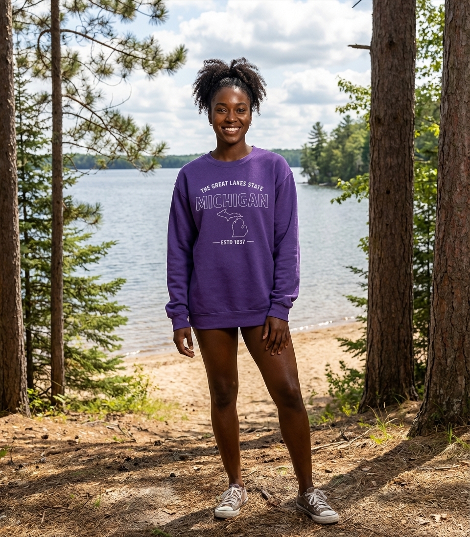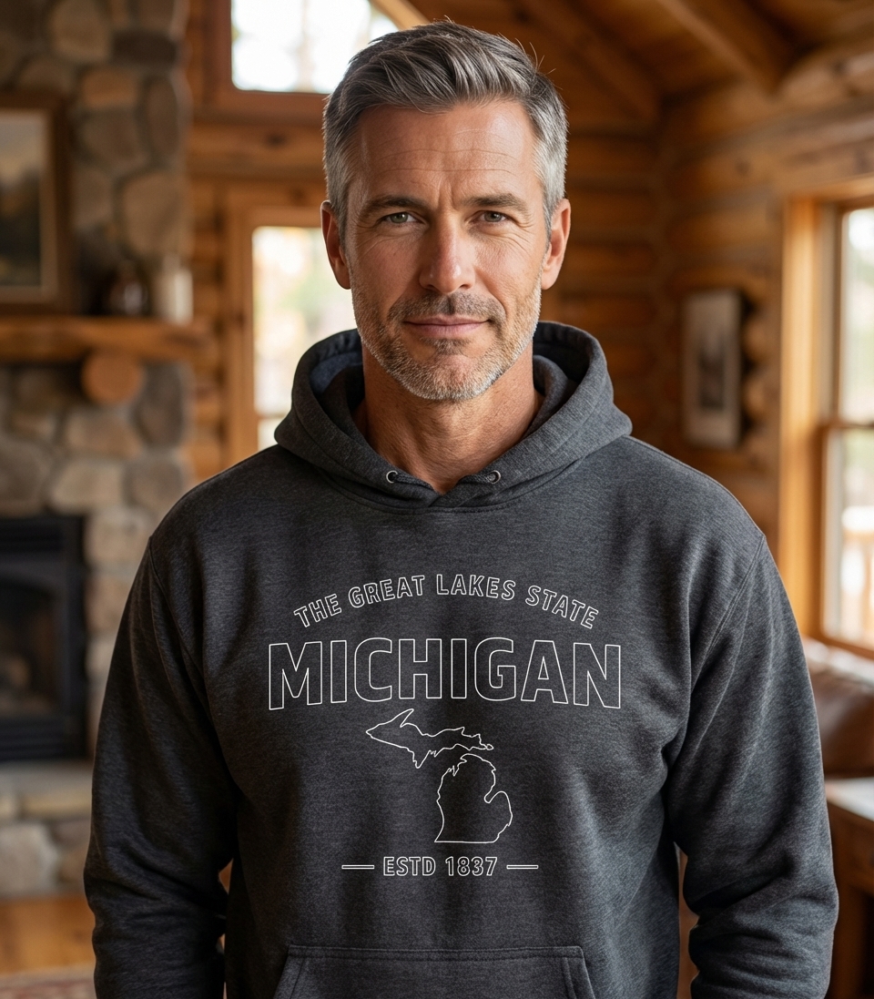 This design proudly displays the outline of Michigan, including both the Upper and Lower Peninsulas, alongside its well-known nickname, "The Great Lakes State." The text "ESTD 1837" commemorates the year Michigan officially became a state.