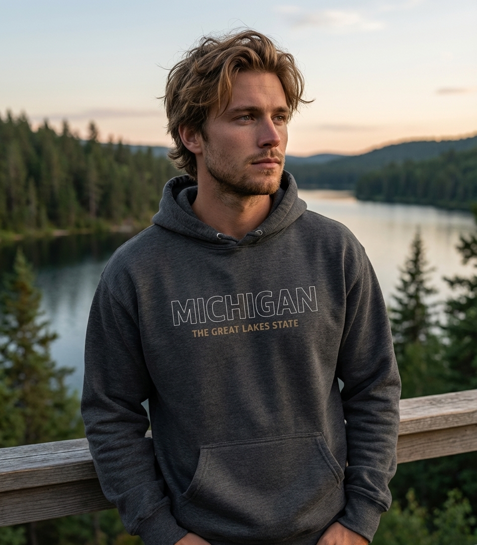 This design celebrates the natural beauty and proud spirit of Michigan, capturing the essence of life in the Great Lakes State.