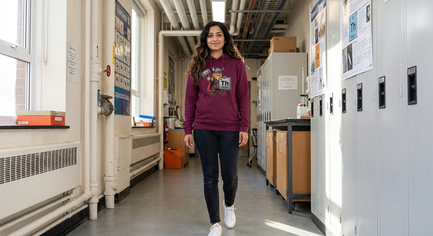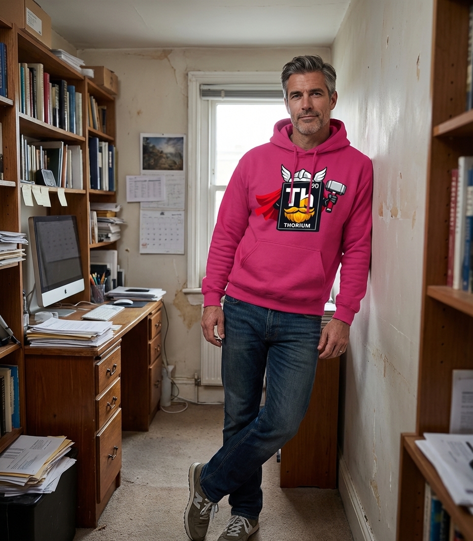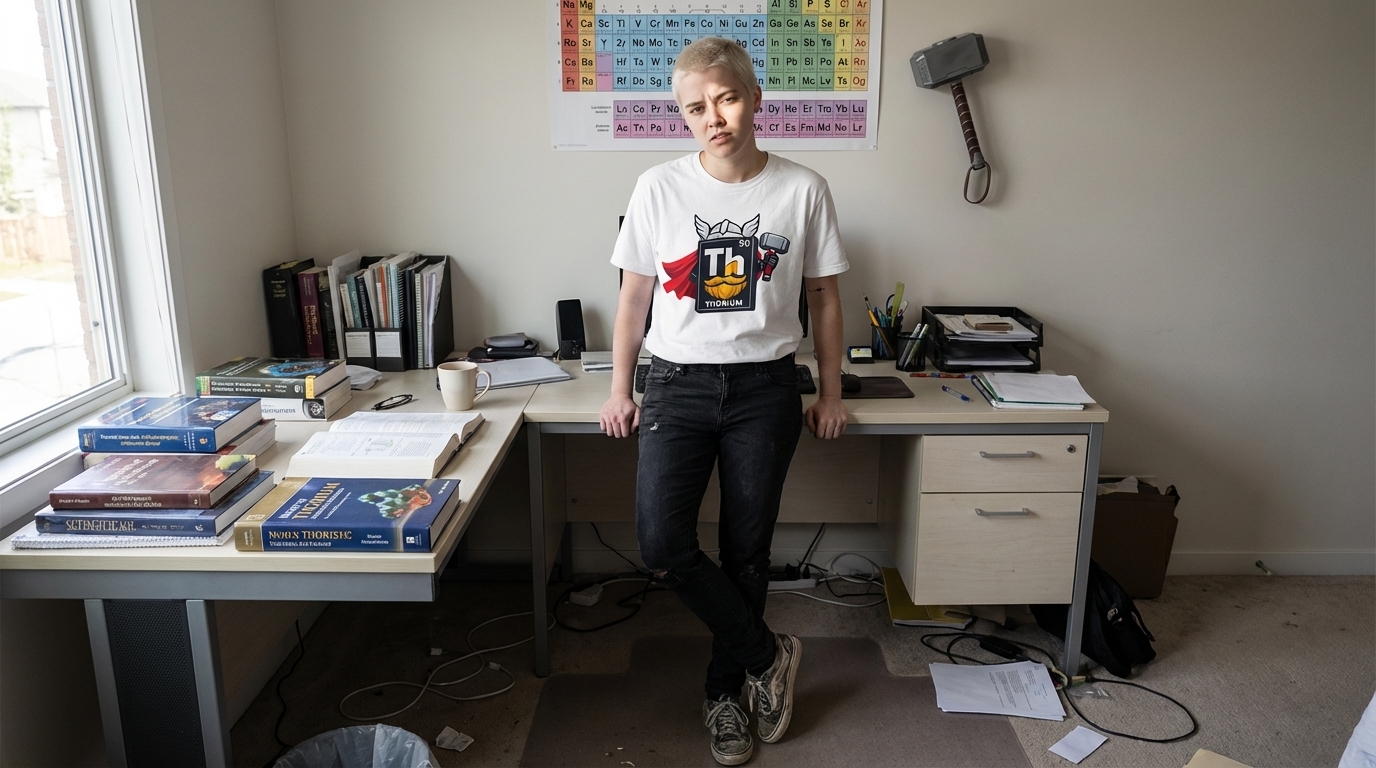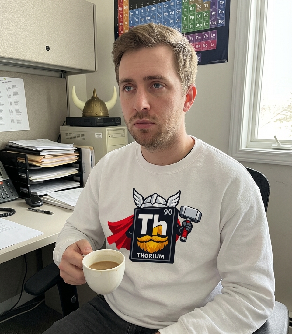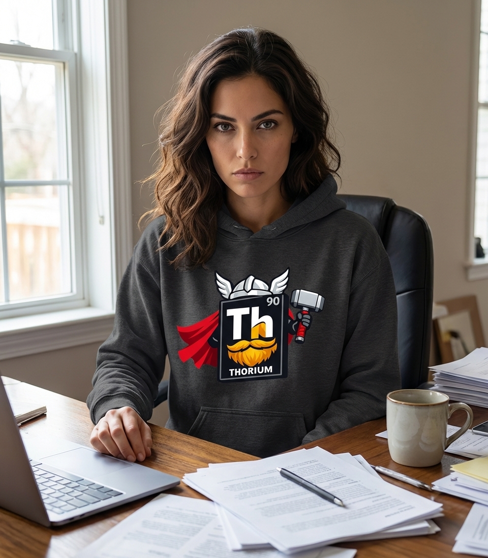 The design plays on the phonetic similarity between "Thorium" and "Thor," transforming a scientific element into a powerful mythological figure. It represents a clever visual pun that resonates with those who enjoy a blend of academic interests and pop culture references. The concept celebrates the "might" of the element itself.