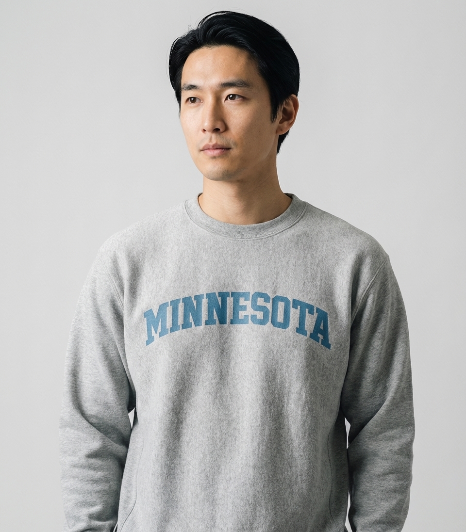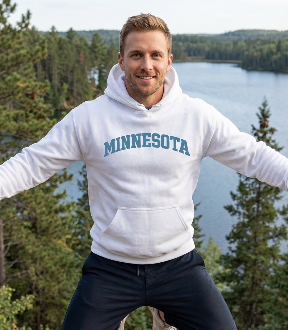The 'Minnesota' arched text design captures the lifestyle of proud Minnesotans who love their home state, its natural beauty, and its vibrant communities.