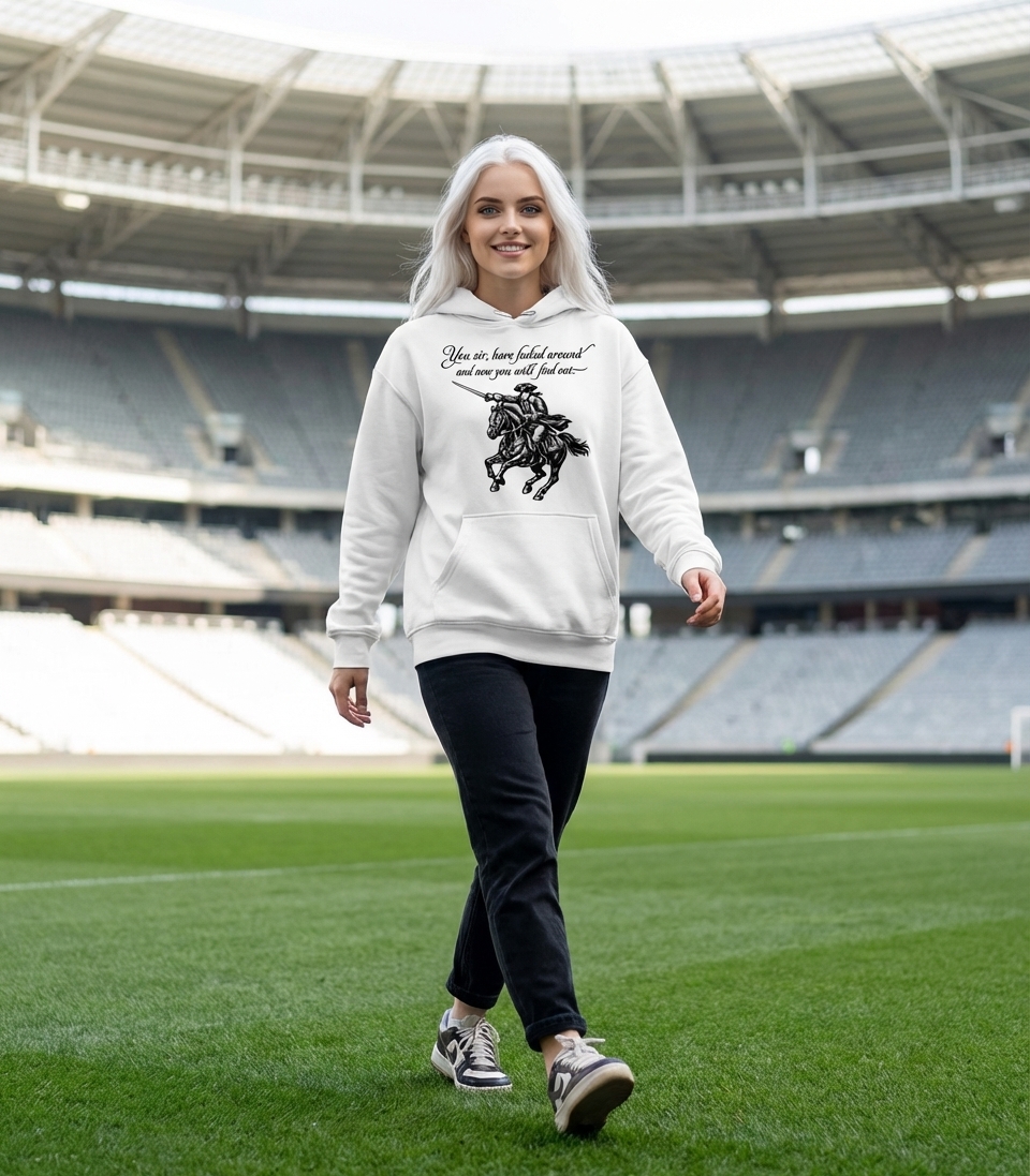 The artwork uses a stark black and white palette, rendered in a detailed linework or woodcut style, giving it a classic and timeless feel. The composition is strong and dynamic, with the horseman in motion and the sword pointed forward, creating a sense of resolve. The faint, distressed text adds an authentic, aged, and mysterious mood, suggesting a historical artifact.