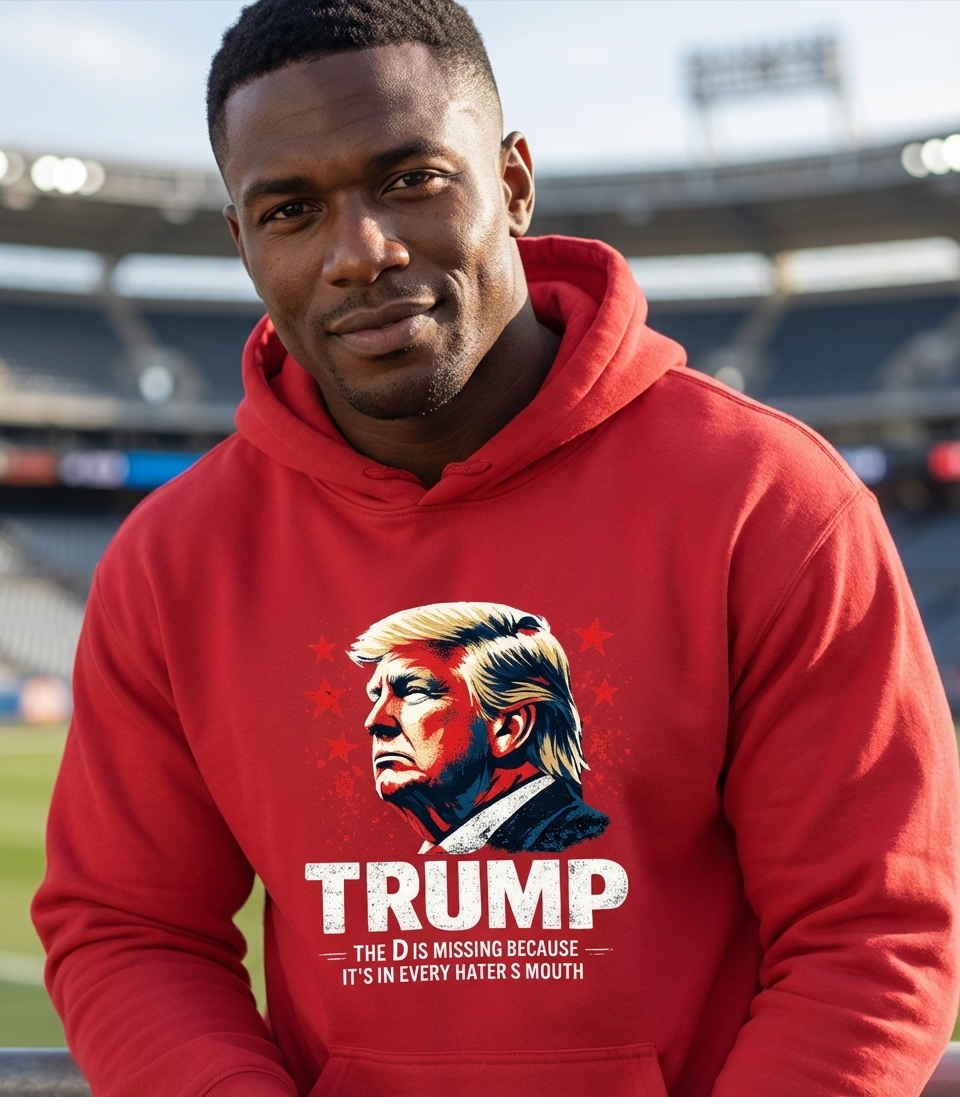 The phrase, "The D is missing because it's in every hater's mouth," is a blunt and satirical jab at political opponents. It serves as an irreverent expression of support for Donald Trump, implying that critics are consumed by their opposition.