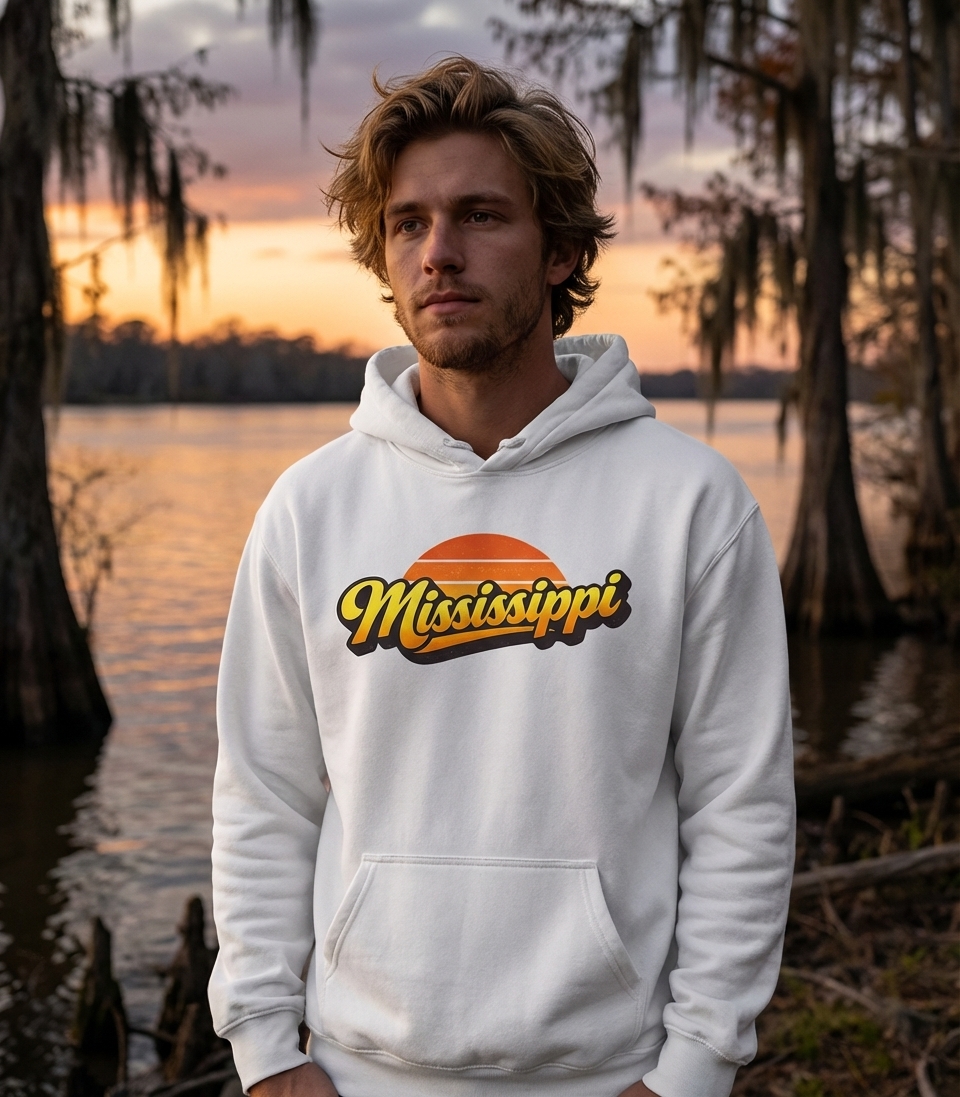 The 'Mississippi' design captures the vibrant spirit of the state with a nostalgic flair, perfect for residents and admirers.