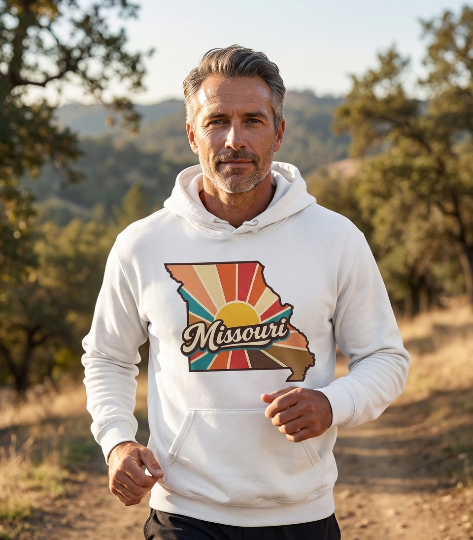 The Retro Missouri Sunset design captures the lifestyle of proud Missourians who love their state's unique charm, rich history, and beautiful landscapes.