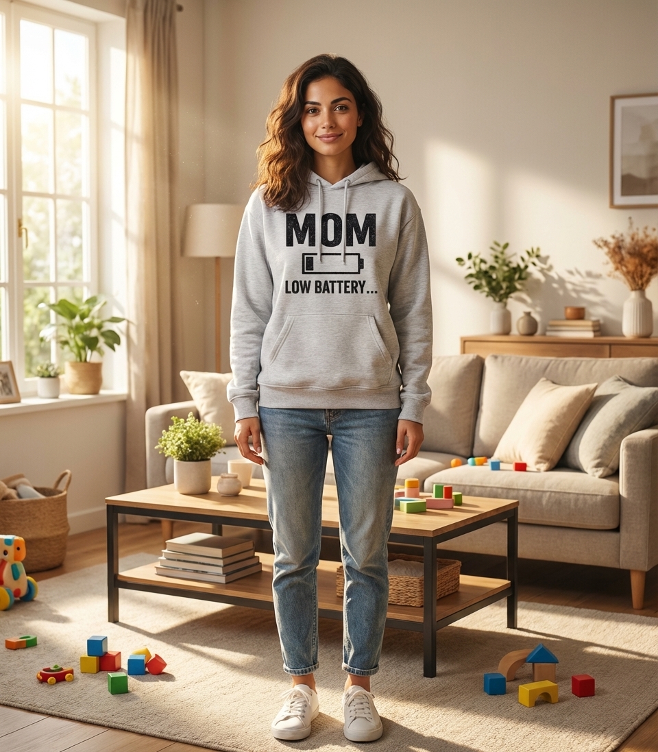 The 'Mom Low Battery' phrase captures the everyday reality of passionate mothers who manage busy schedules, nurture their families, and occasionally feel a bit drained.