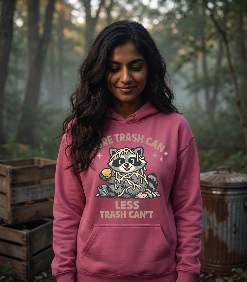 This unique design features a charming cartoon raccoon, playfully entangled in a pile of spaghetti and holding a trash can lid. It combines the lovable mischievous nature of raccoons with a humorous and uplifting message.