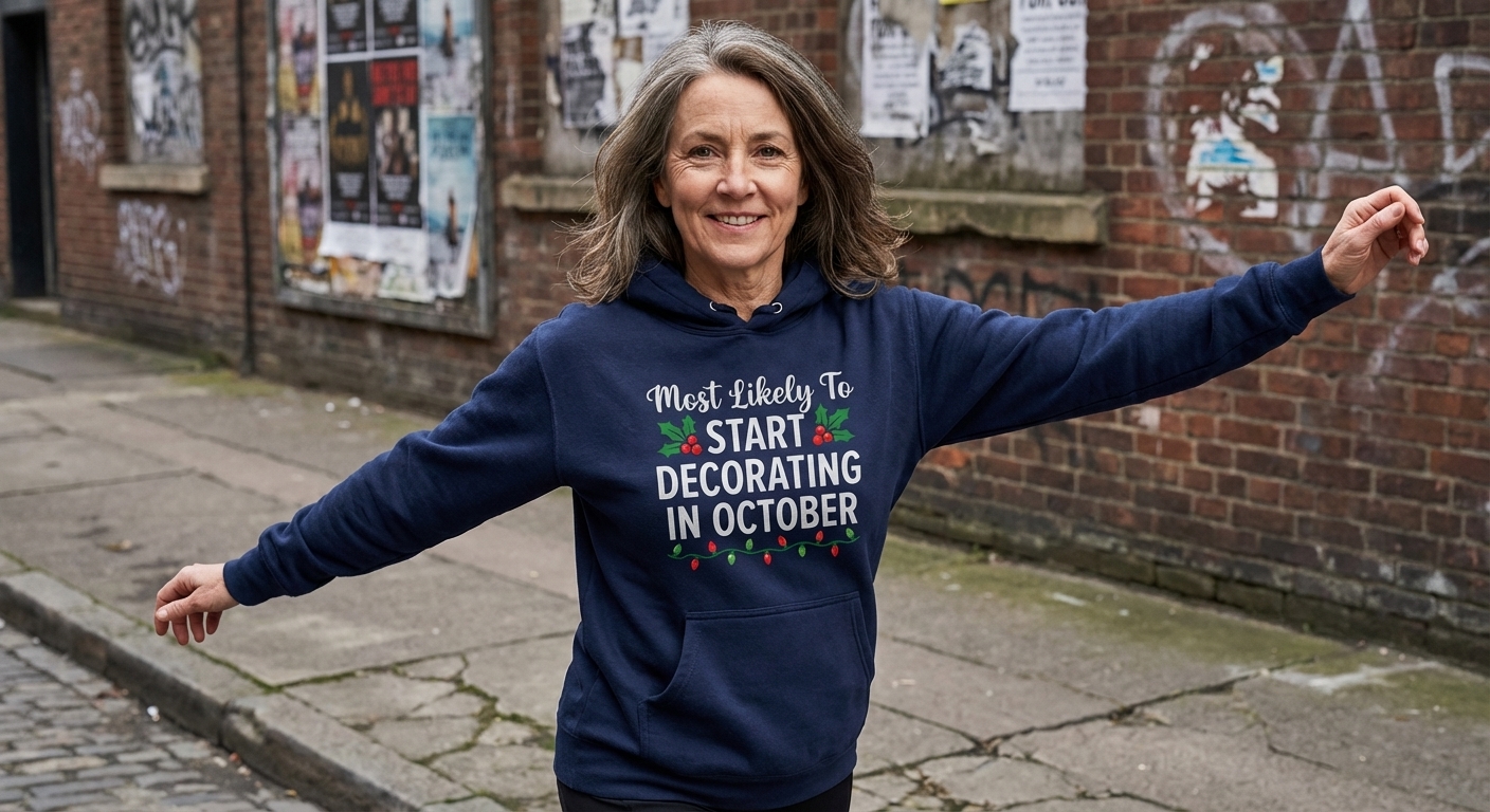 The "Most Likely To Start Decorating In October" phrase humorously captures the lifestyle of dedicated holiday enthusiasts who eagerly embrace the festive season early.