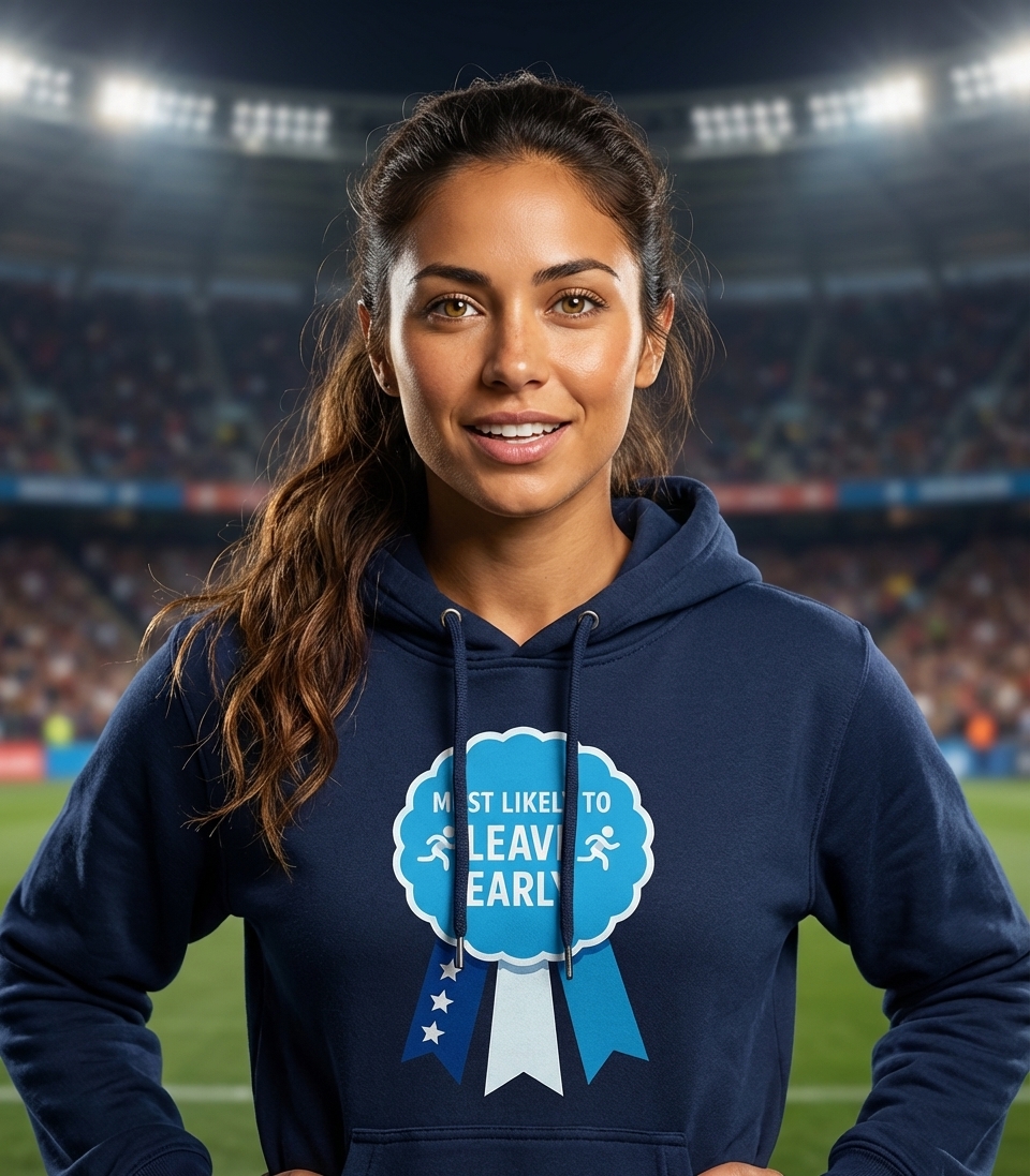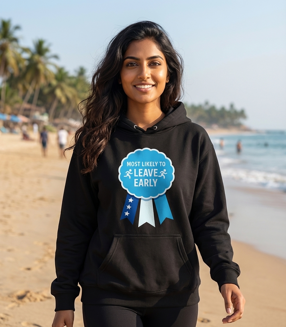 The 'Most Likely To Leave Early' phrase captures the relatable desire of anyone eager to escape the daily grind or a long event.