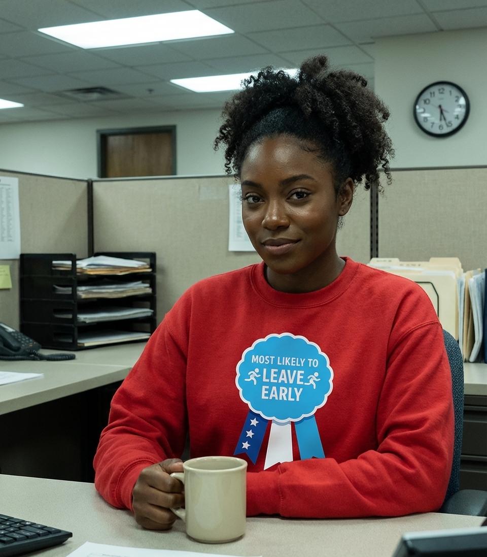This design celebrates the joy and relief of making a quick getaway. It embodies a shared sentiment among many who dream of an early escape from their daily commitments.