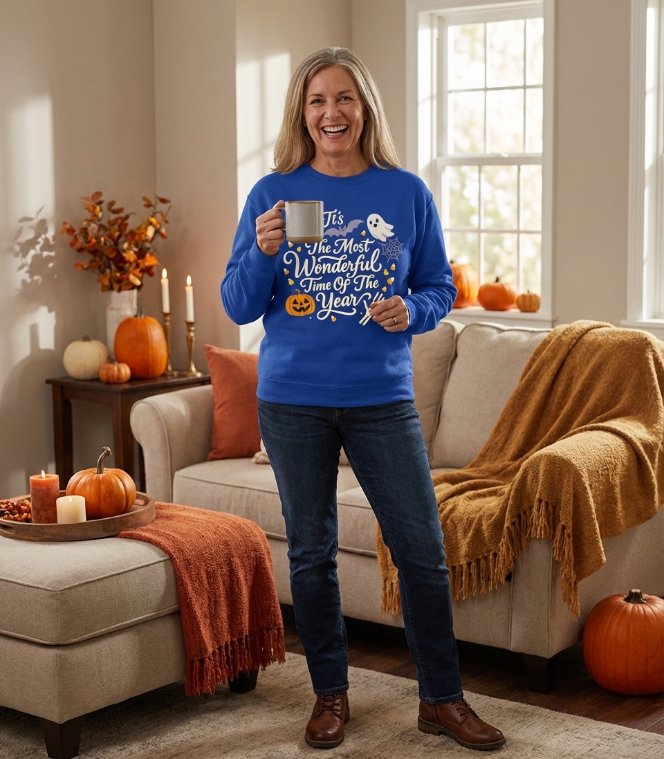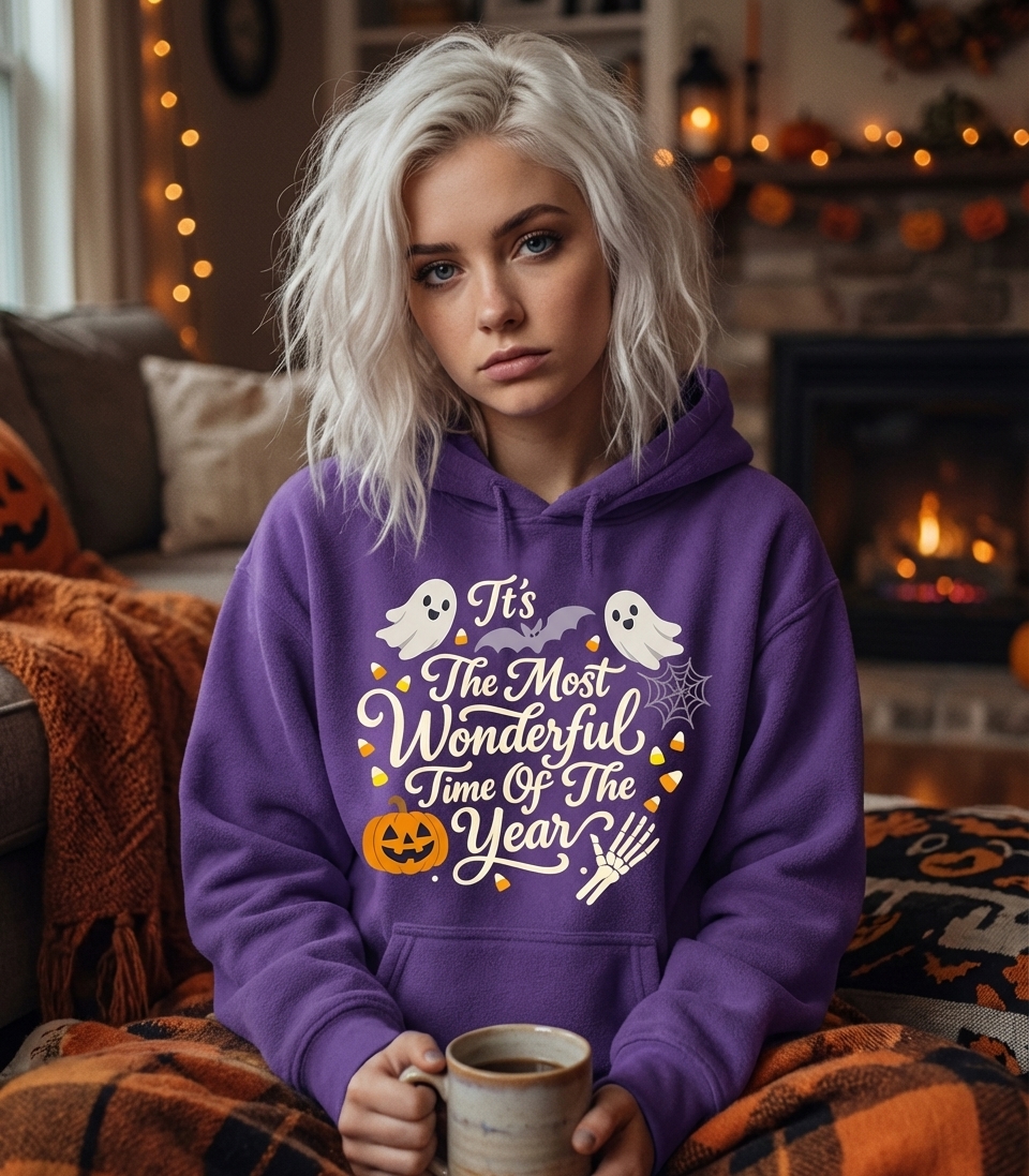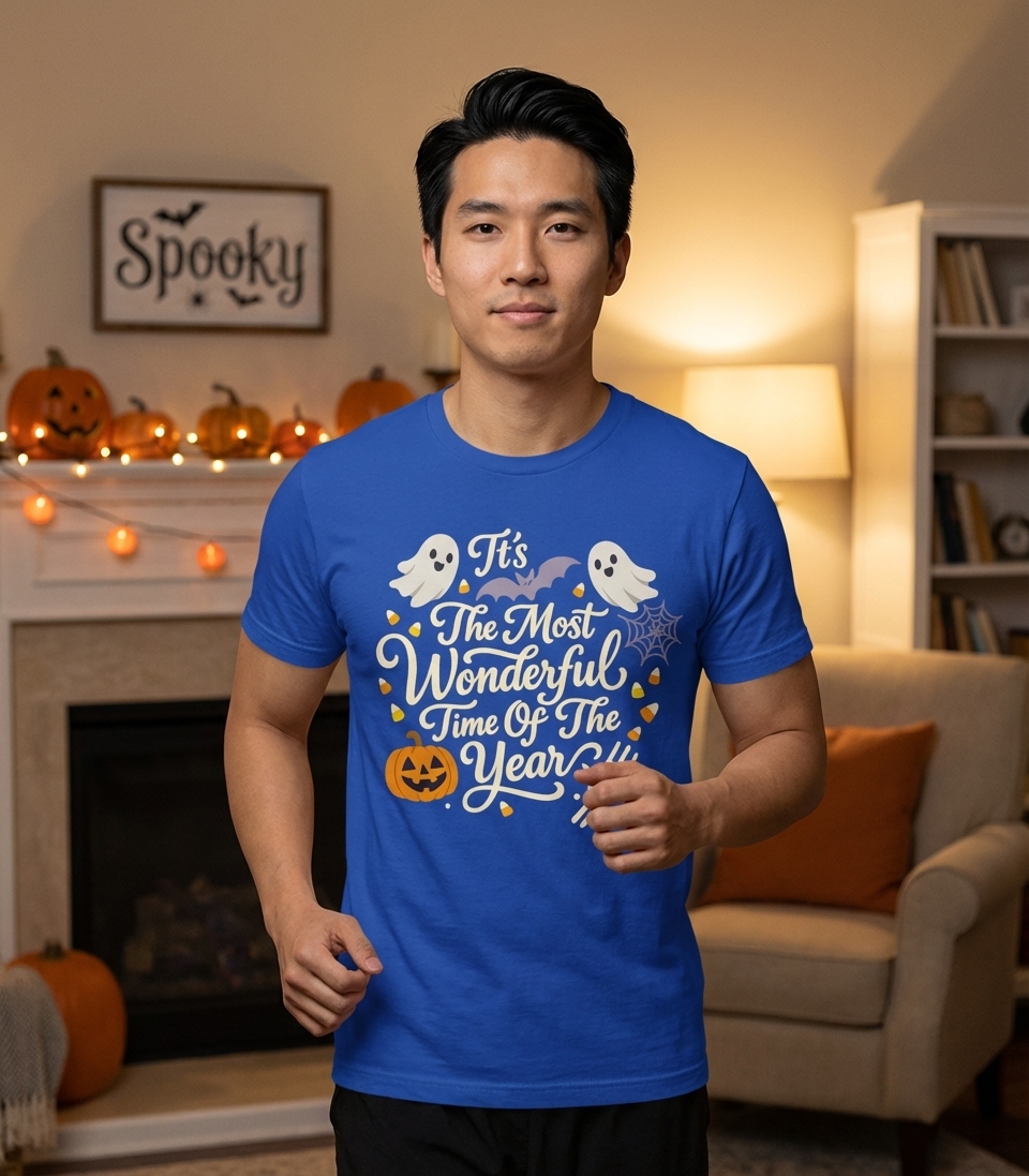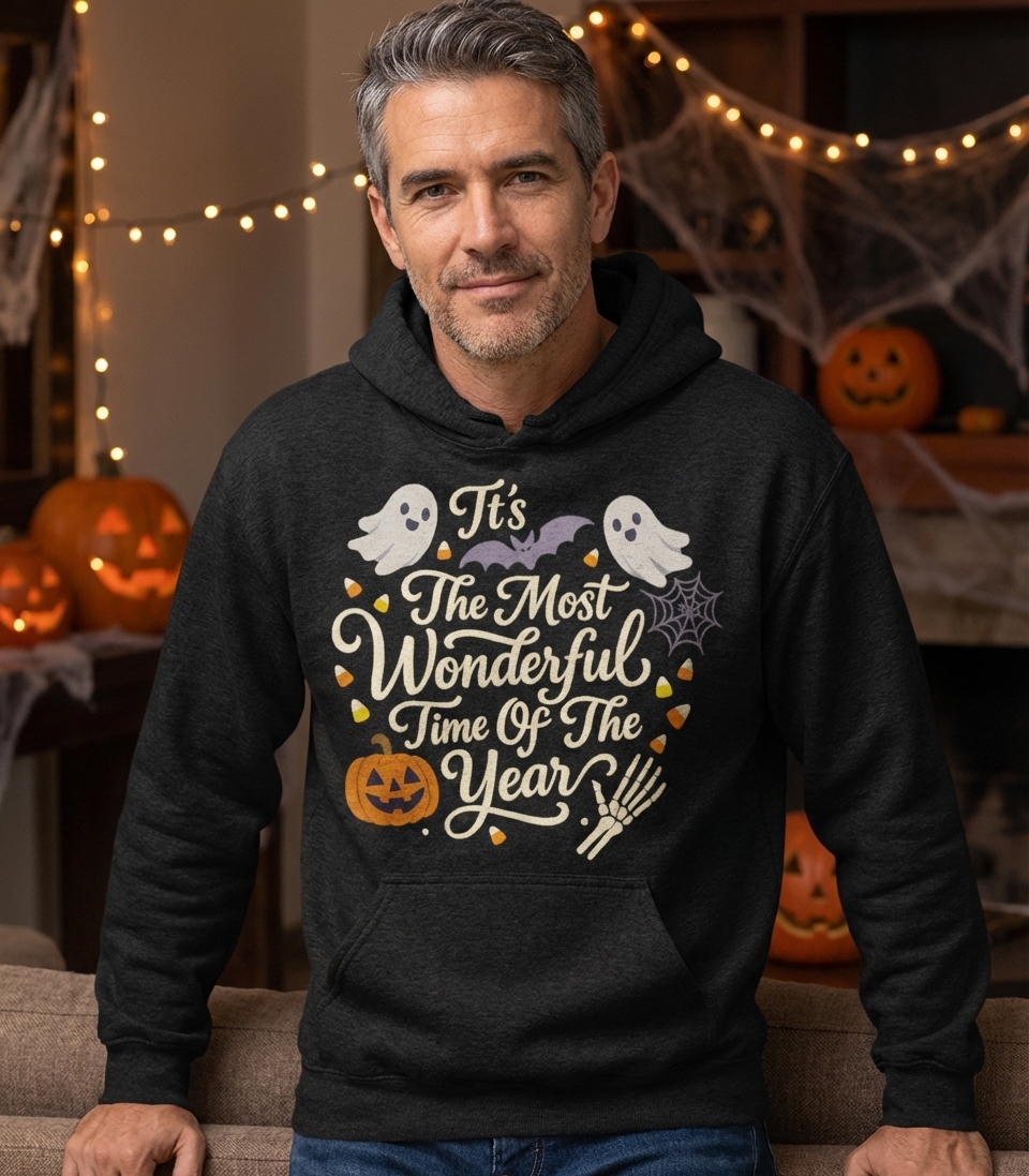 The 'Wonderful Time Of Year Halloween' phrase captures the lifestyle of passionate Halloween enthusiasts who spend their days decorating, trick-or-treating, and embracing all things spooky.