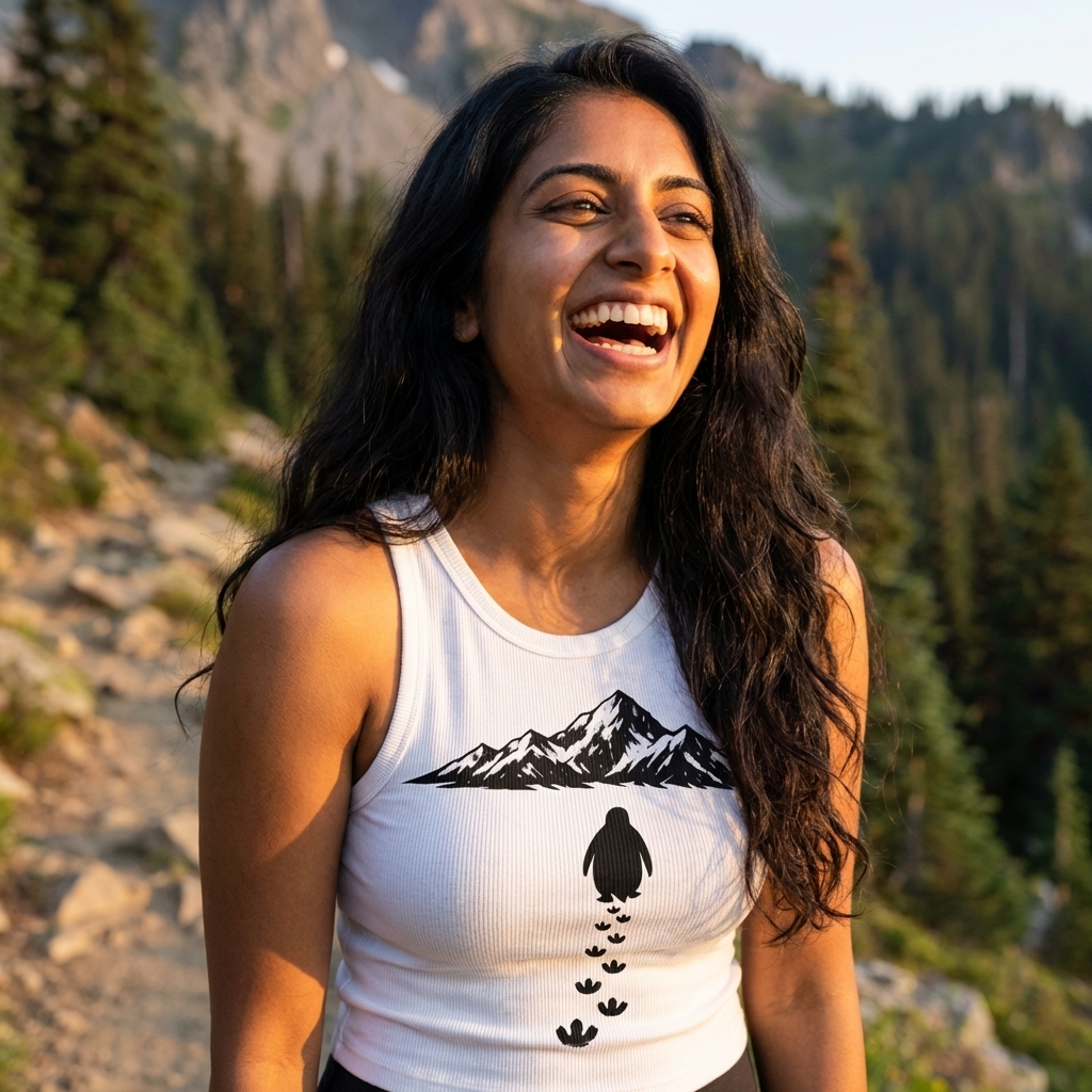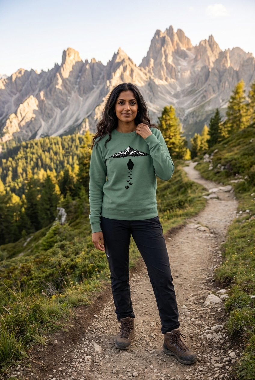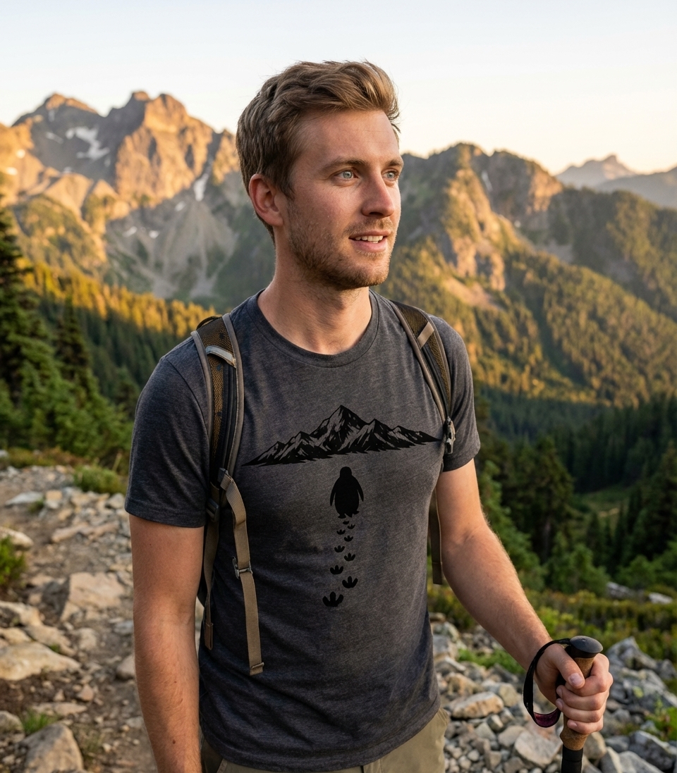 The striking mountain range graphic captures the lifestyle of passionate outdoor adventurers who spend their days hiking, exploring, and embracing the wild.