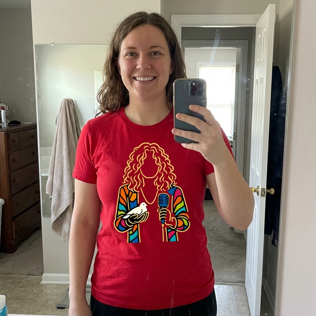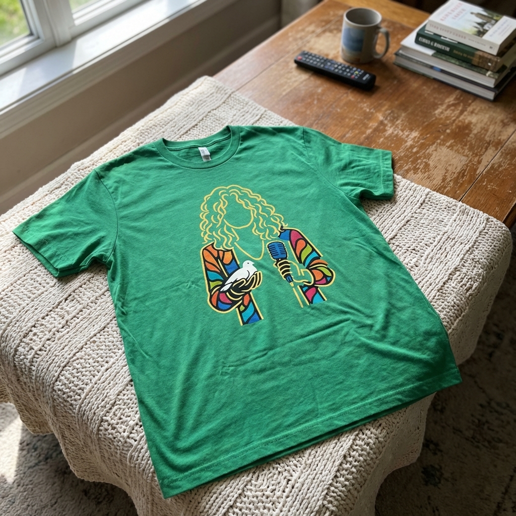- Graphic tees with doves and microphones
