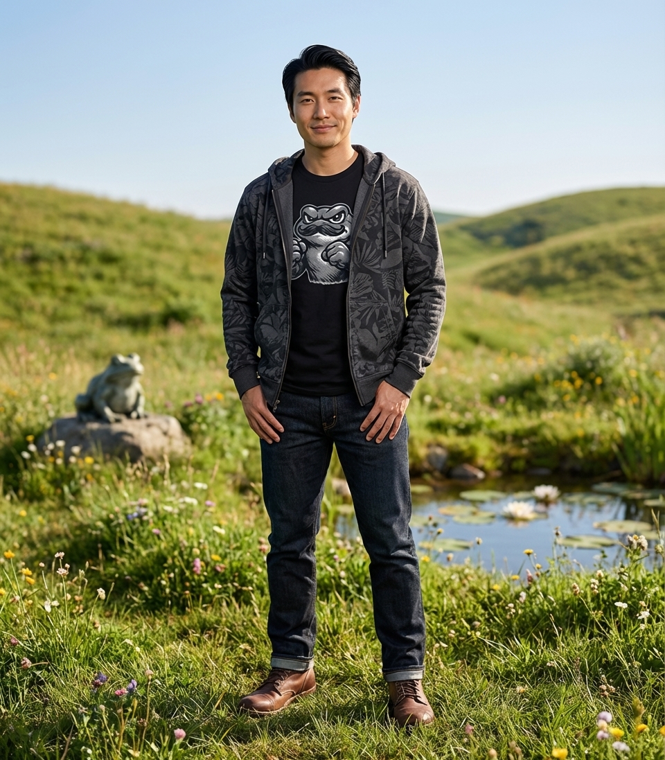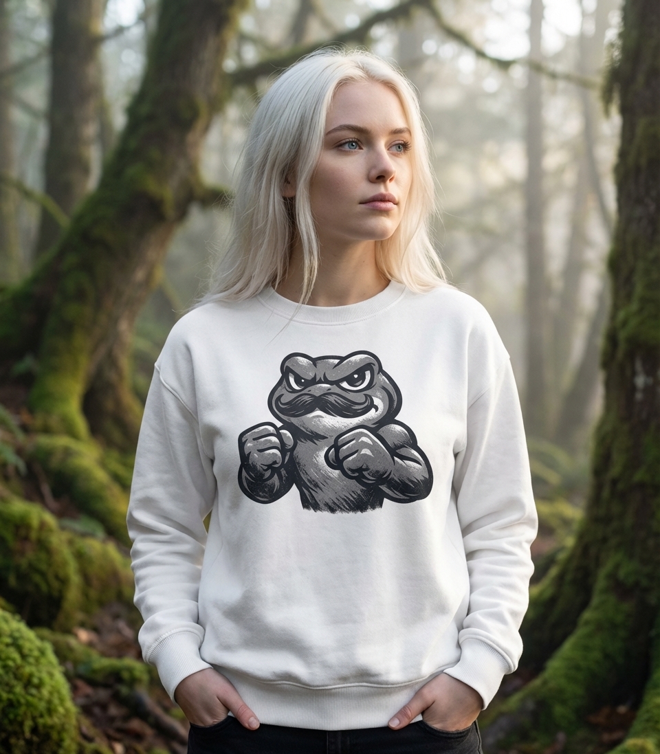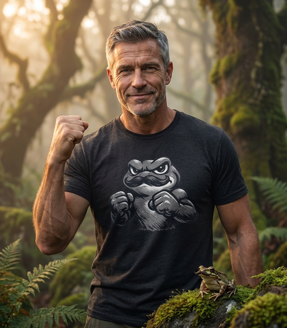 This unique artwork features a bold, grayscale illustration of a muscular frog. With a distinguished handlebar mustache and fists clenched, this amphibian exudes confidence and a readiness for action.