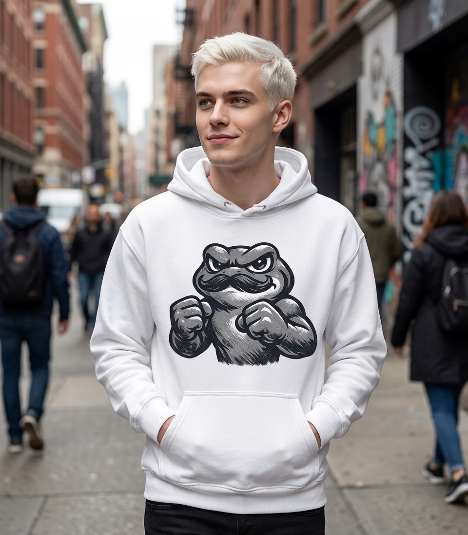 Yes! Check the style selector above to see all available options including hoodies and sweatshirts for the Mustache Frog Fighter graphic.