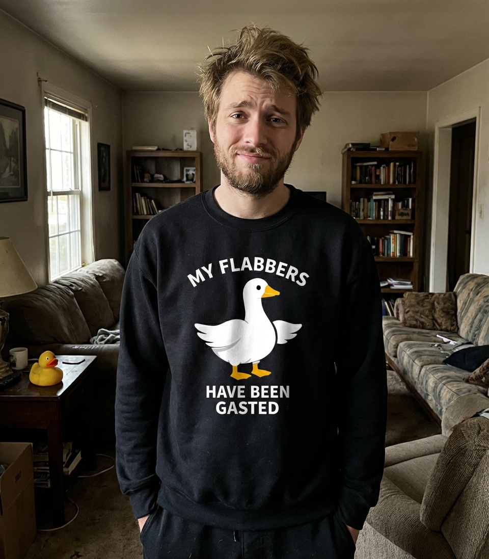 This playful design features a charming cartoon duck paired with the amusing phrase "My Flabbers Have Been Gasted." It's a fun and lighthearted take on being utterly surprised or flabbergasted.