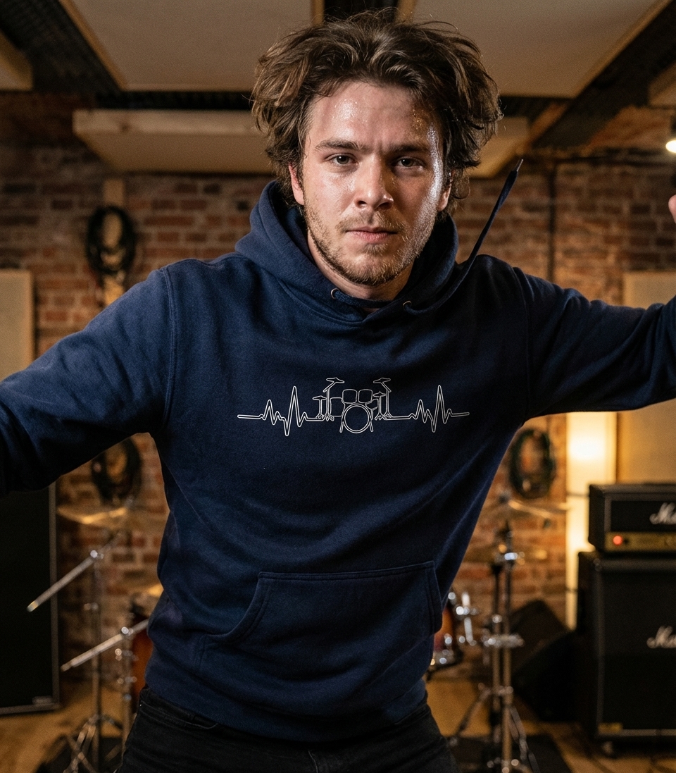 This unique drum kit heartbeat graphic captures the passionate lifestyle of drummers who live for rhythm, practice beats, and make music.