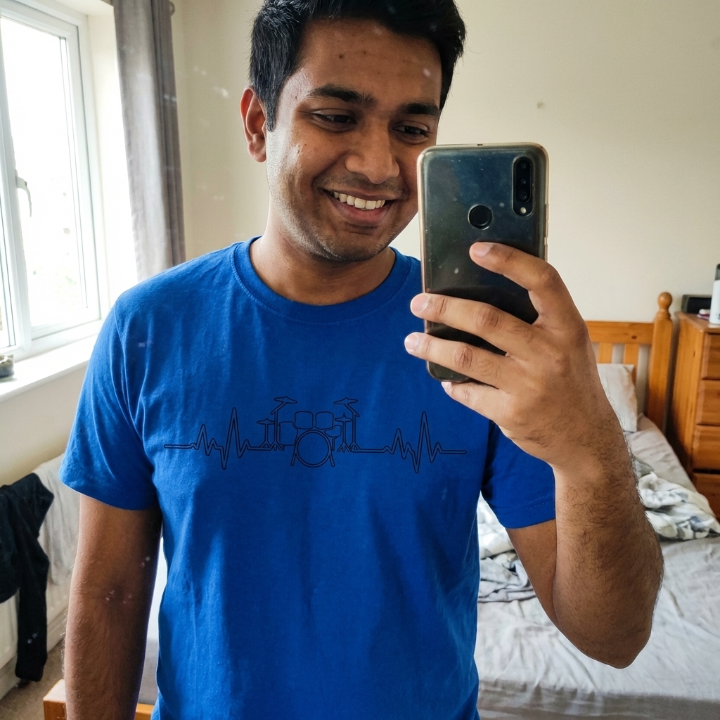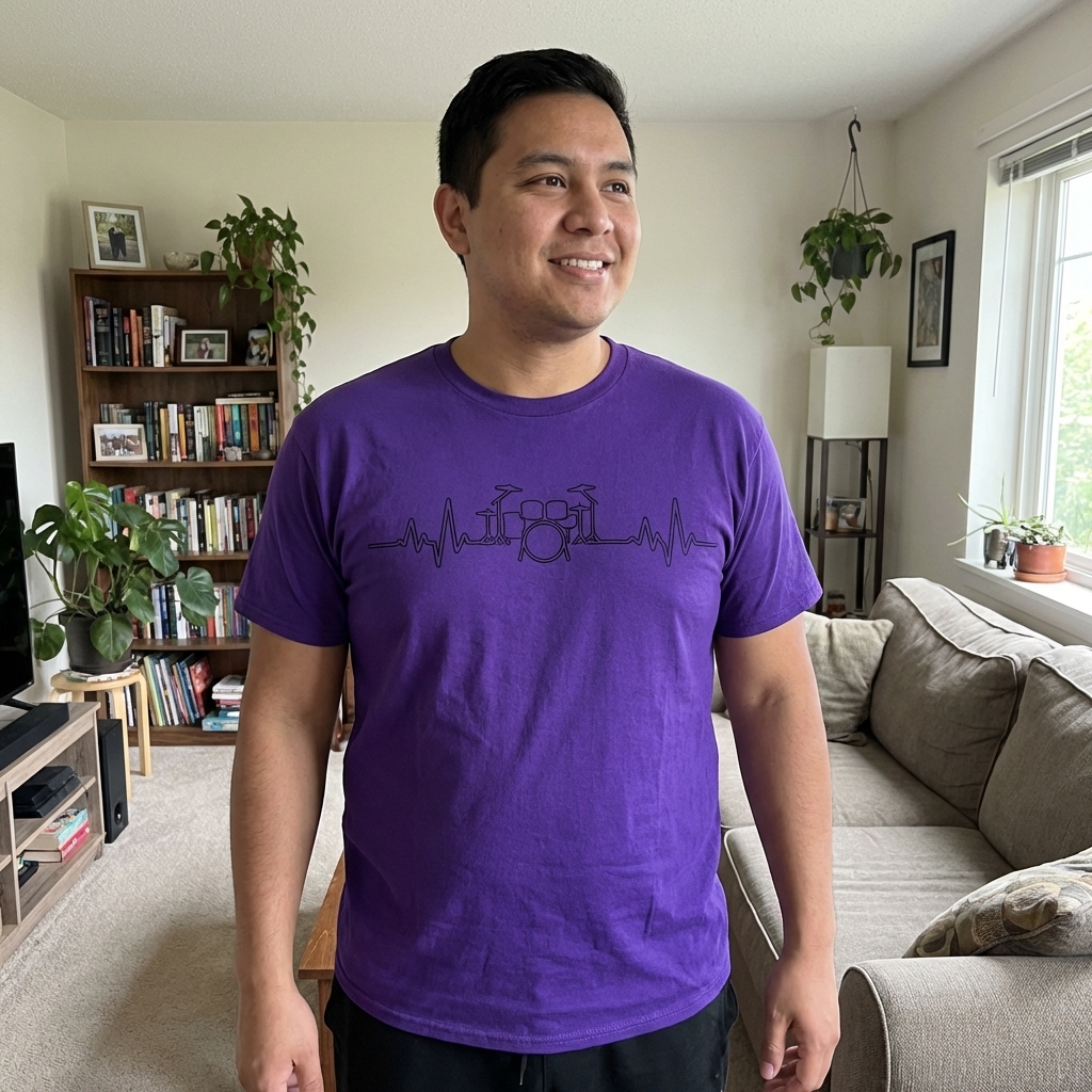 this tee is exactly what i was looking for, super comfy material and the heart beats drums design is just *chef's kiss*. love how it's subtle but still shows off my thing. solid purchase!