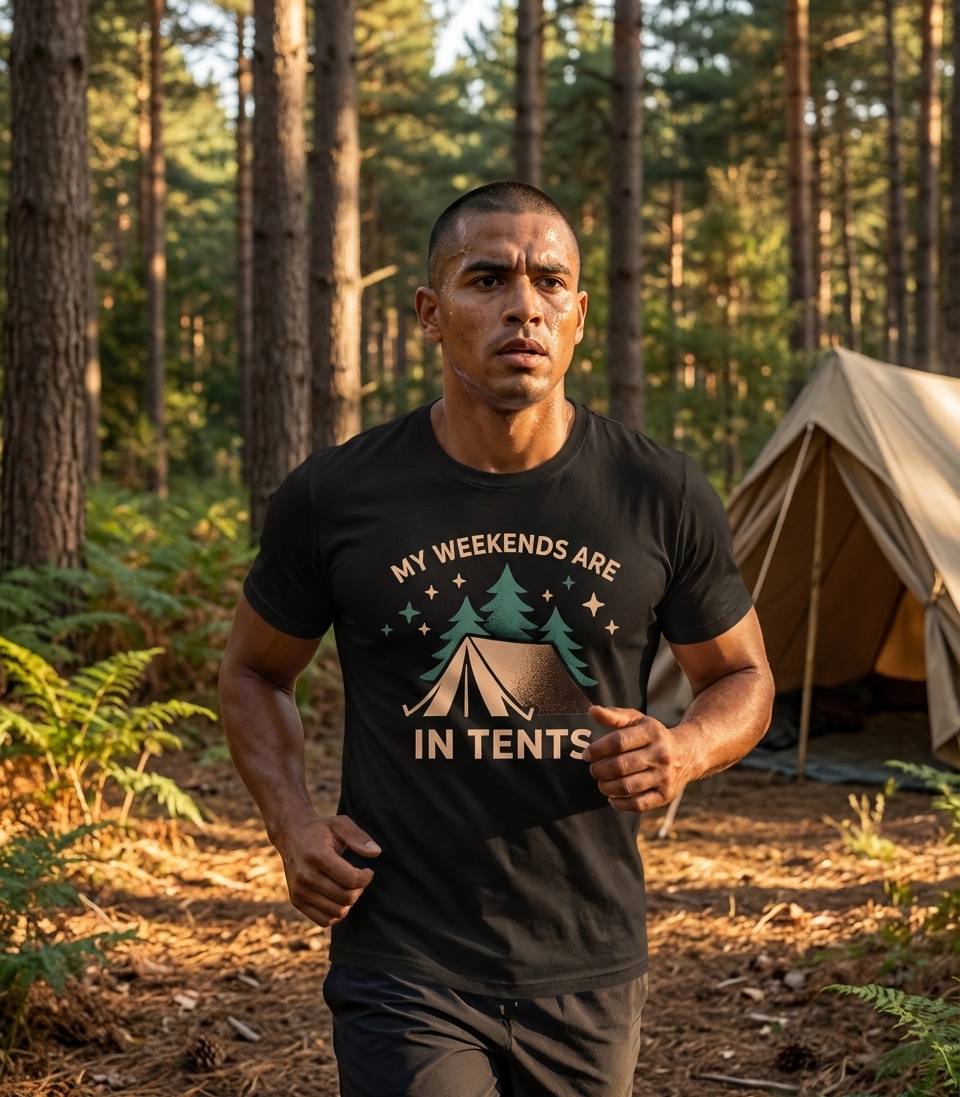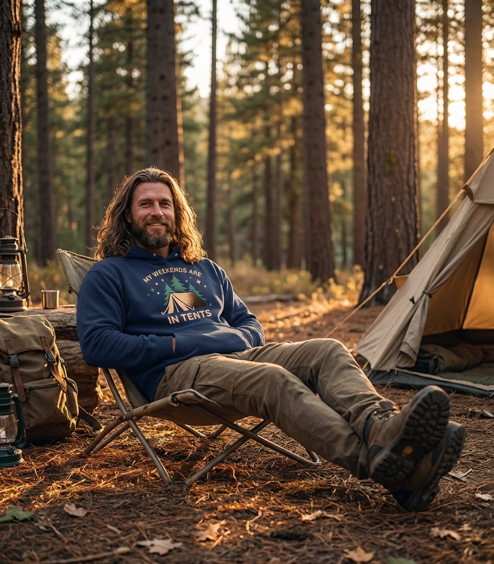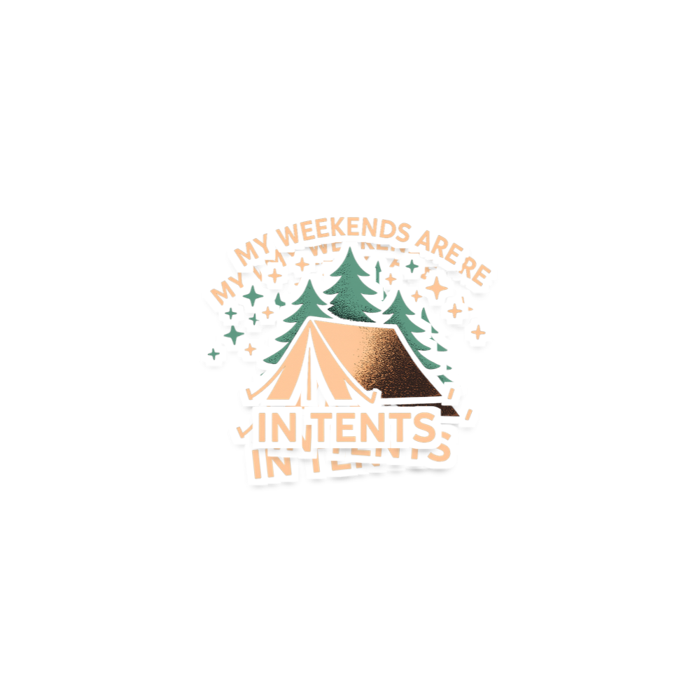 The 'My Weekends Are In Tents' phrase captures the lifestyle of passionate outdoor enthusiasts who spend their days enjoying nature, setting up camp, and finding peace under the stars.
