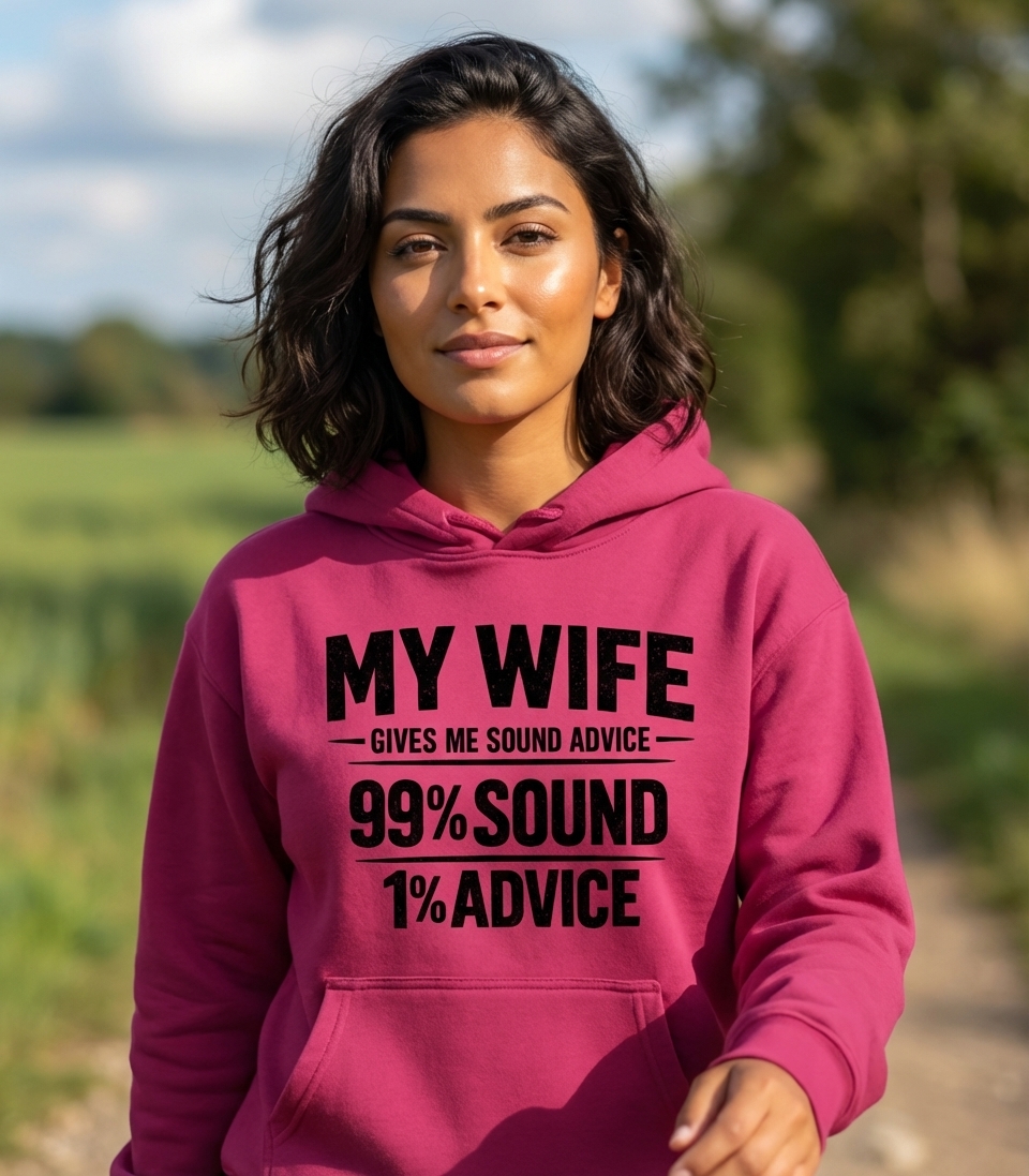 The 'My Wife 99% Sound 1% Advice' phrase humorously highlights the clever insights and playful dynamic often shared within married life.