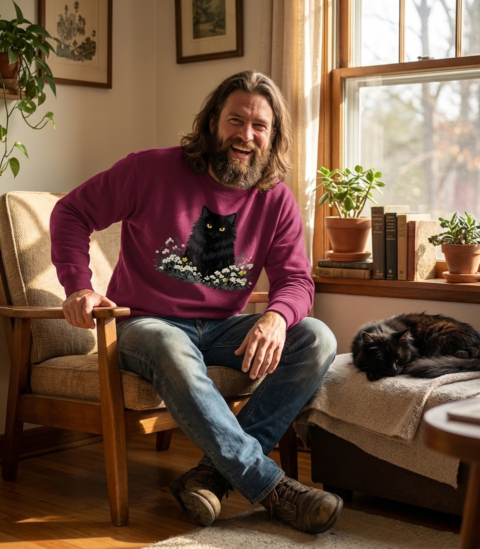 The enchanting graphic captures the allure of passionate cat lovers who appreciate feline mystery, floral beauty, and the quiet magic of nature.