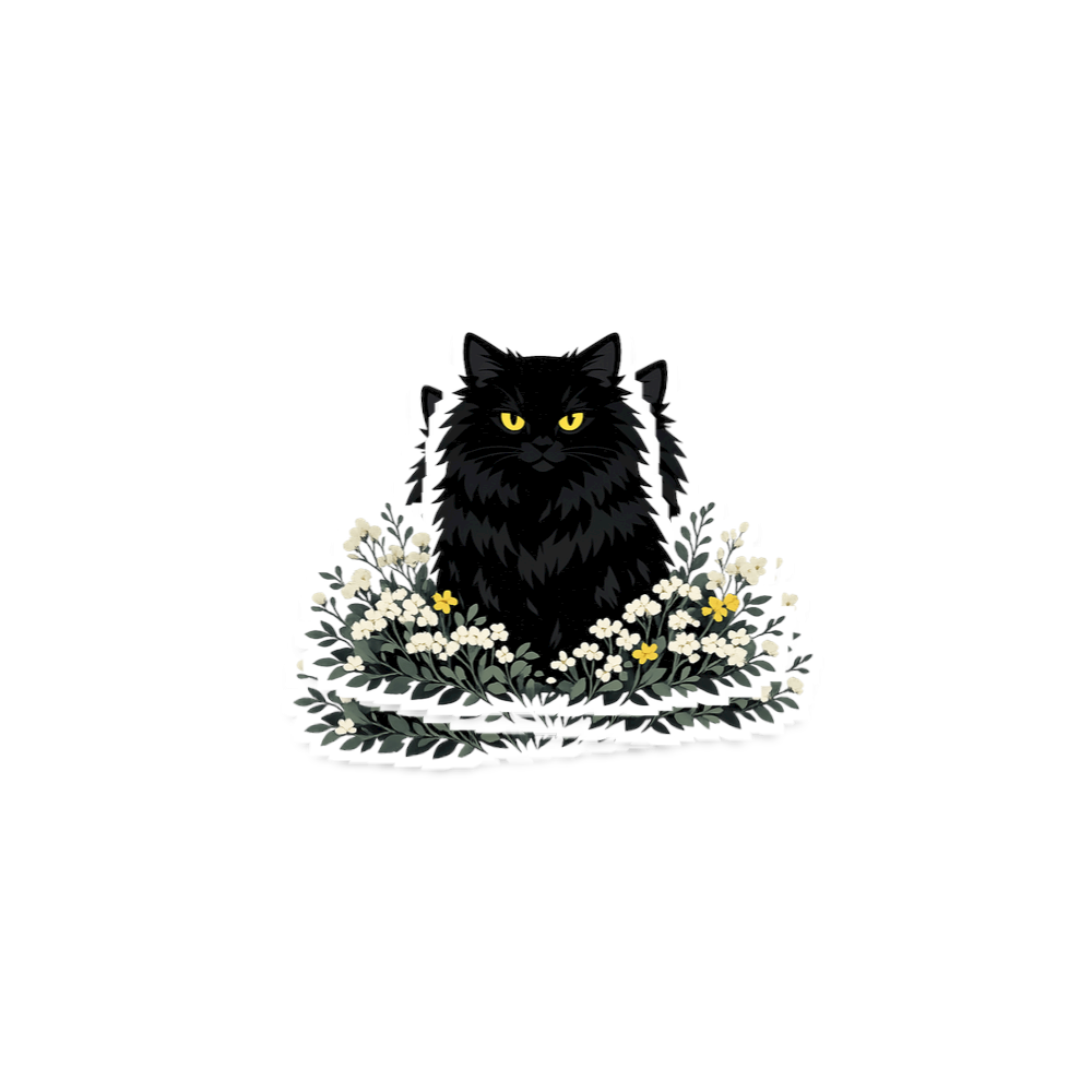 The visual speaks to the enigmatic charm of black cats, often associated with mystery, independence, and strong spirit. Paired with wildflowers, it symbolizes harmony between the wild and gentle, representing a connection to untamed nature.