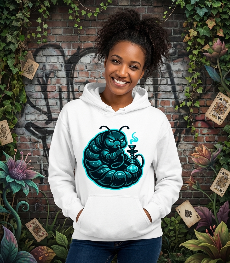 While this design doesn't feature an explicit phrase, it visually embodies the iconic, philosophical, and somewhat mischievous nature of the hookah-smoking caterpillar from classic literature.
