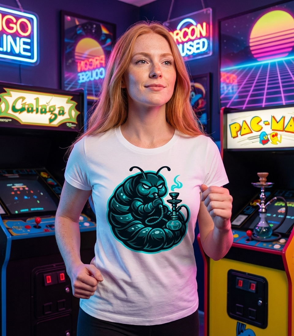 This striking graphic features a stylized caterpillar enjoying a hookah, rendered with a modern, glowing aesthetic. The design reimagines a classic literary character with a bold, contemporary edge, perfect for those who appreciate unique artistic interpretations.