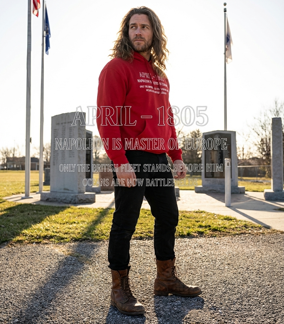 This design transports you to April 1805, a pivotal moment in European history. It highlights Napoleon Bonaparte's vast control over the continent. The text emphasizes the British fleet as the sole remaining obstacle to his complete supremacy.