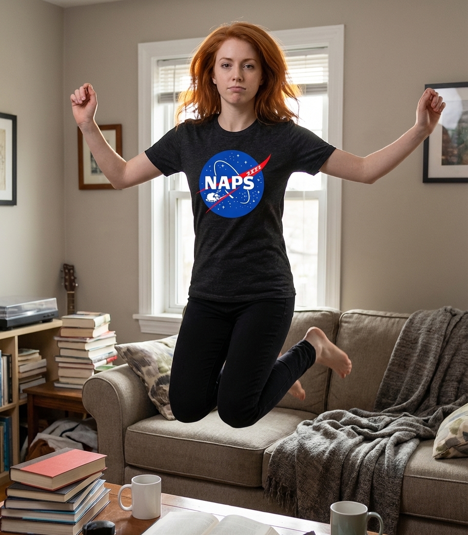 The core phrase 'NAPS' is a playful acronym substitution, directly referring to short periods of sleep. This design humorously suggests that the wearer's ultimate mission, much like space exploration, is the pursuit of peaceful slumber and relaxation.