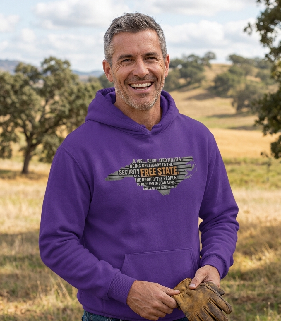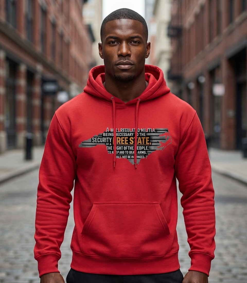 This design encapsulates the spirit of passionate North Carolinians who advocate for constitutional freedoms and the right to bear arms.