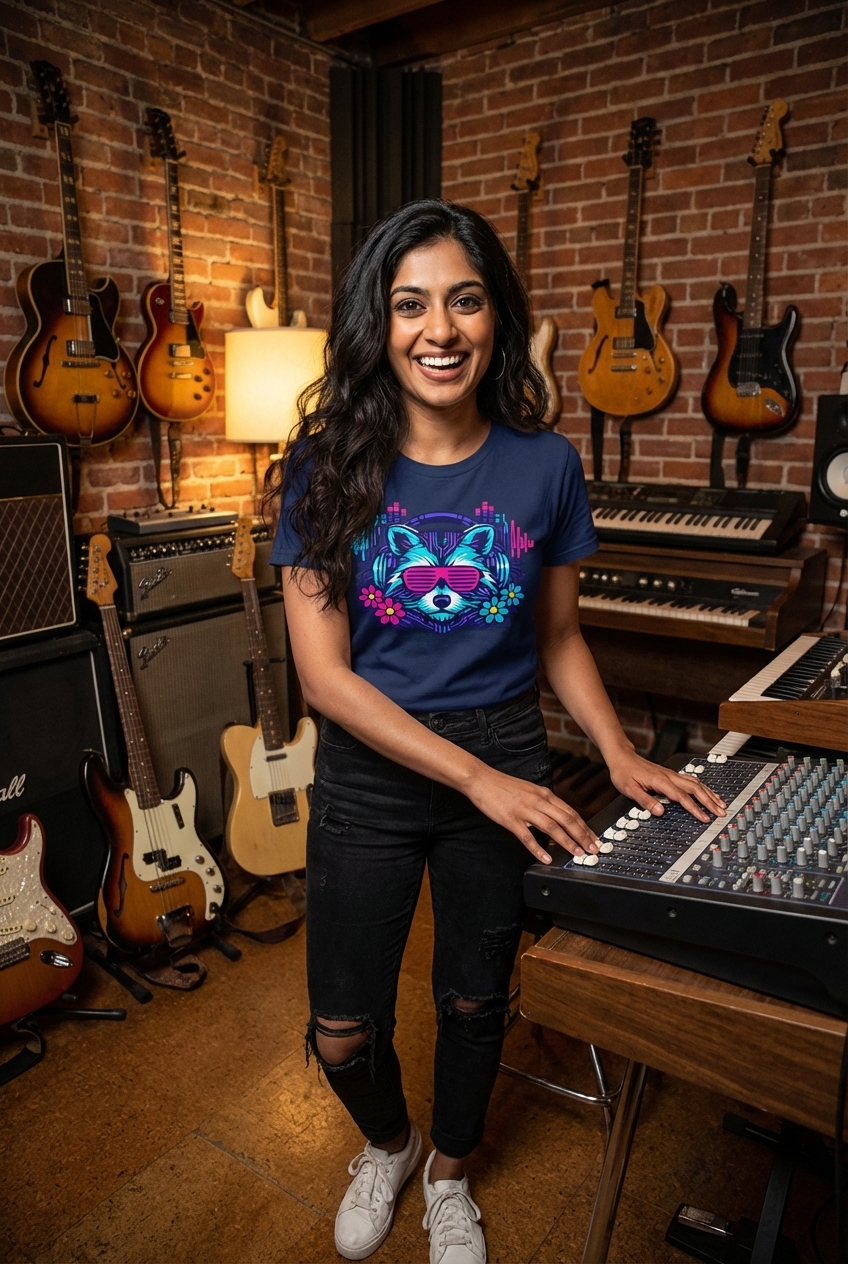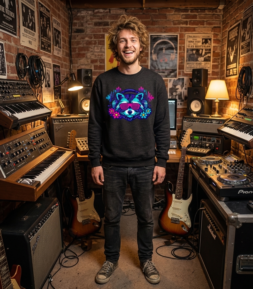 This unique design features a stylized raccoon, a symbol of cleverness and adaptability, depicted in a cool, electronic music-inspired setting. Wearing shutter shades and headphones, the raccoon embodies a relaxed yet vibrant energy, merging nature with modern tech culture.
