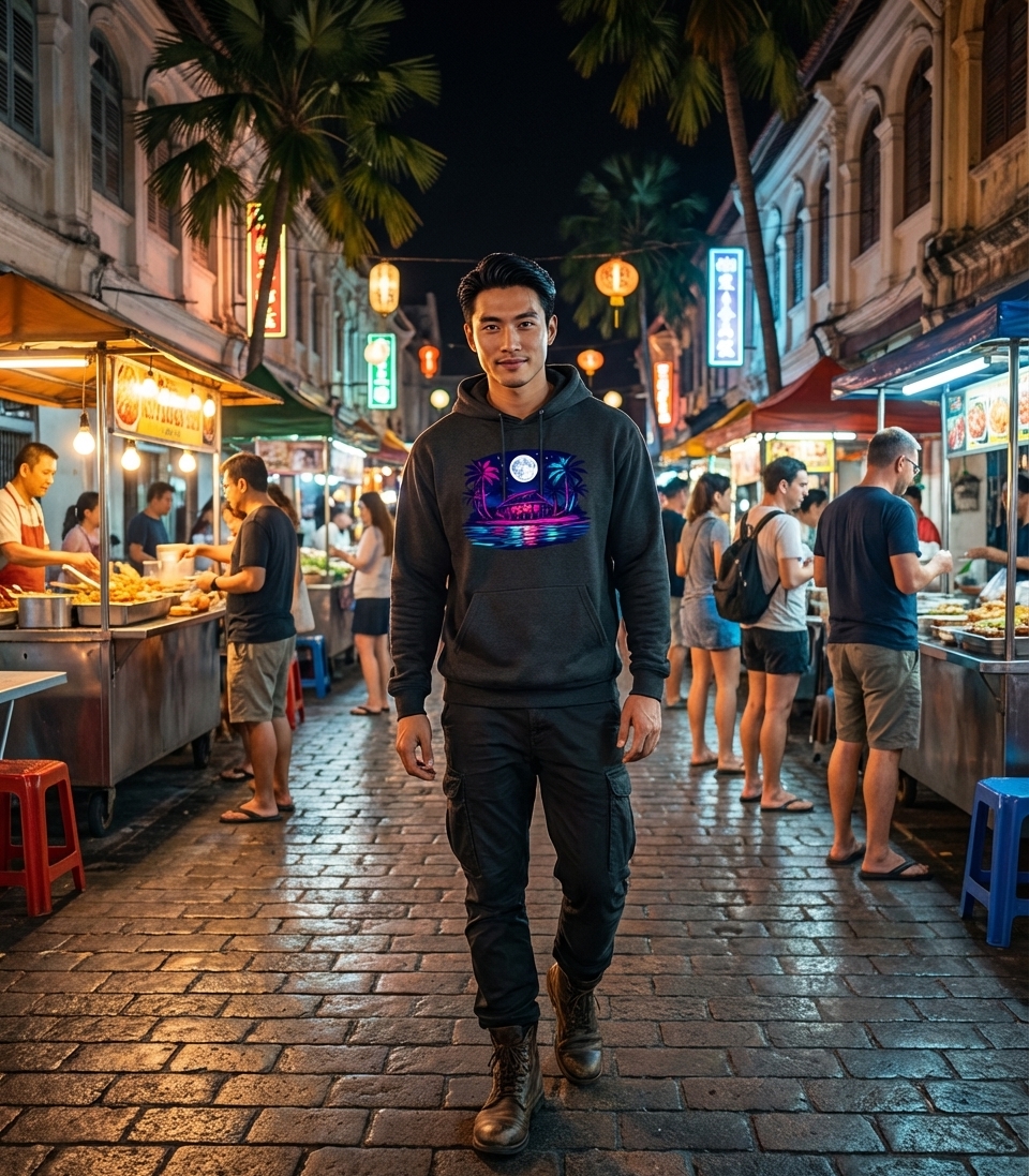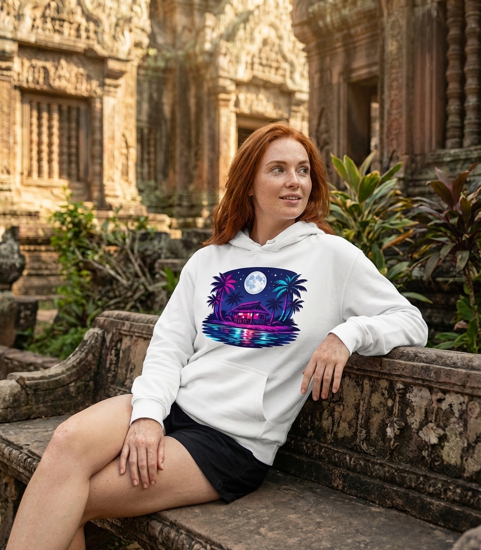 This retro-futuristic design captures the serene lifestyle of adventurers who dream of moonlit beaches, neon sunsets, and tranquil island escapes.