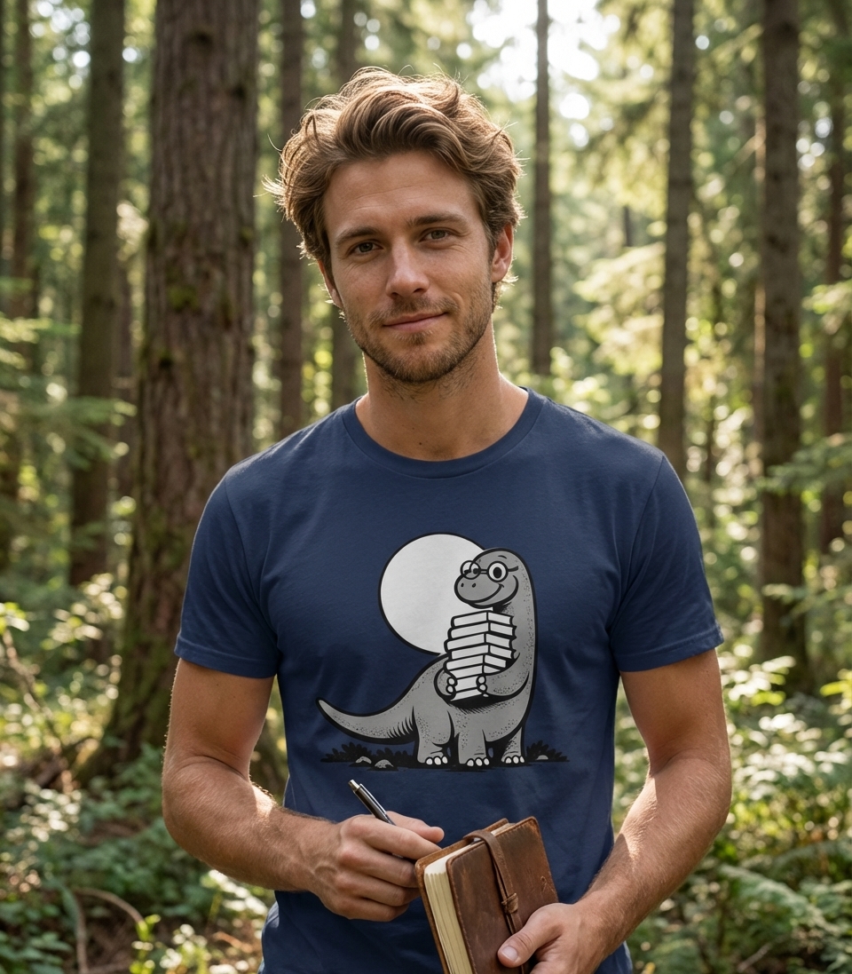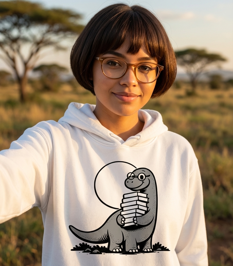 The design embodies the spirit of intellectual curiosity and the joy of reading. It playfully suggests that even ancient creatures appreciate the pursuit of knowledge. It's a fun take on being a bookworm with a twist.