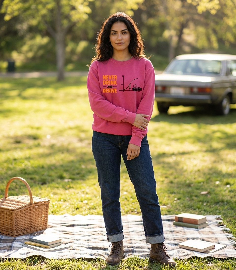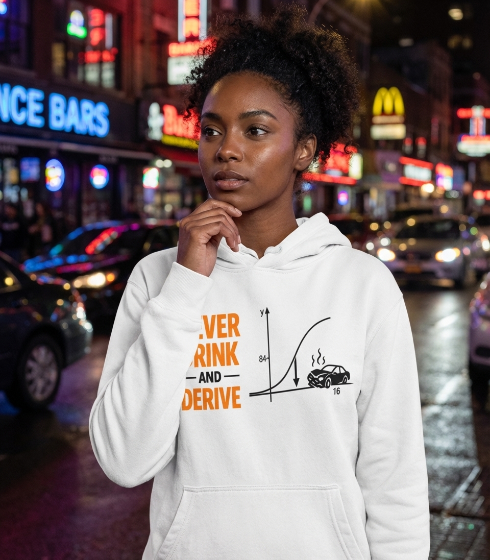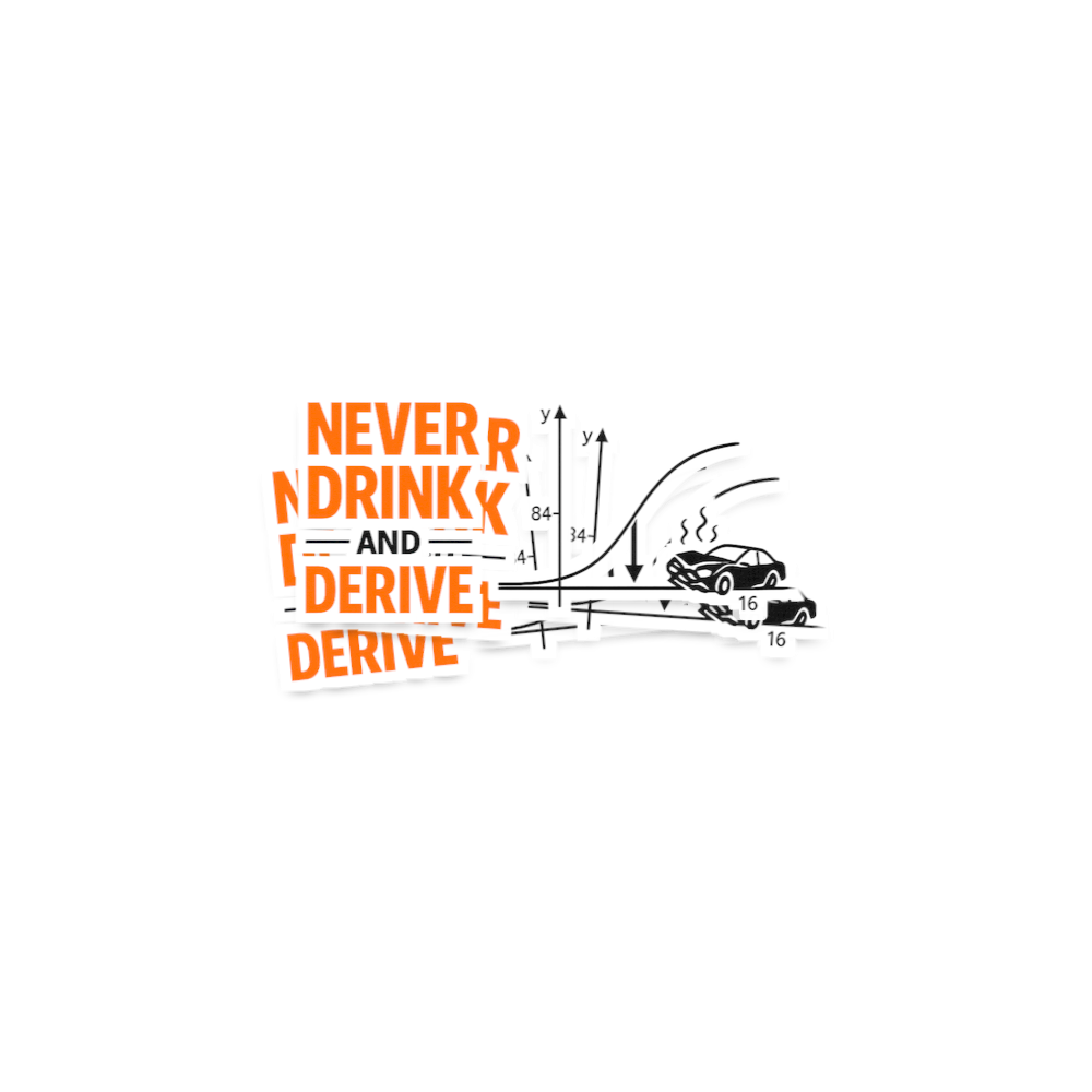 This design ingeniously combines a well-known safety message with a touch of advanced mathematics. The graphic features bold orange text stating "NEVER DRINK AND DERIVE," accompanied by a subtle graph illustrating a curve leading to a crashed car, humorously implying the perils of attempting complex calculations while impaired. It's a smart visual pun that resonates with those familiar with calculus.