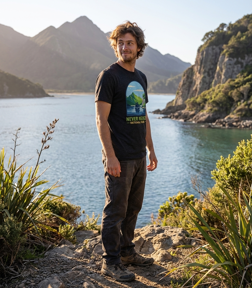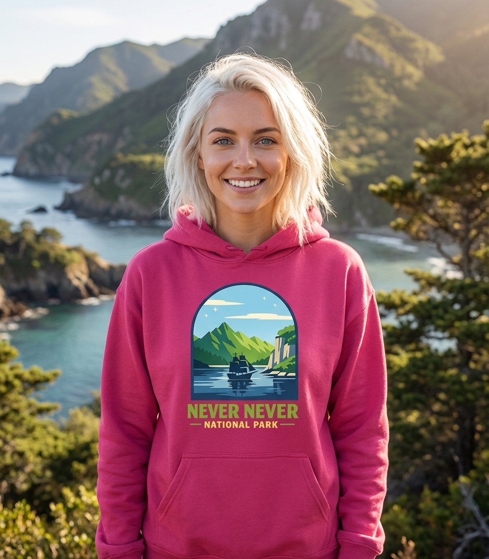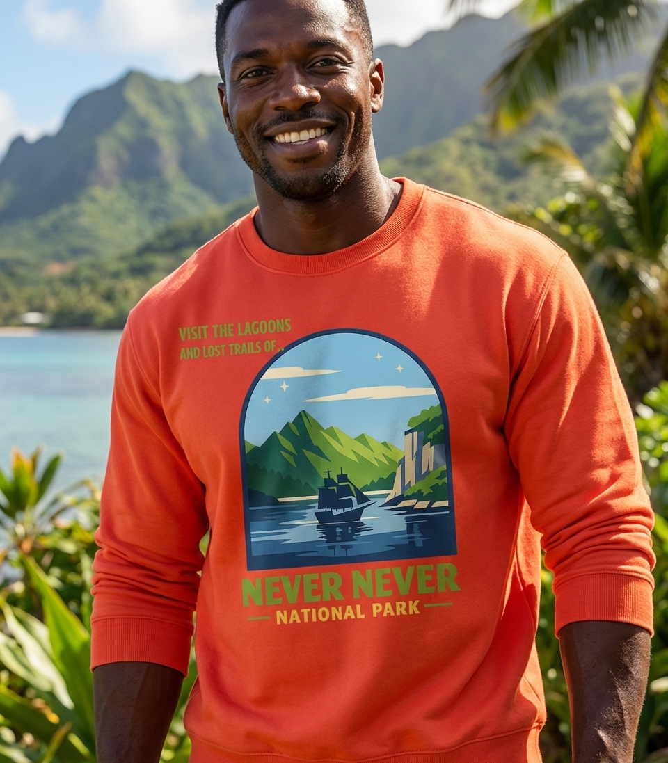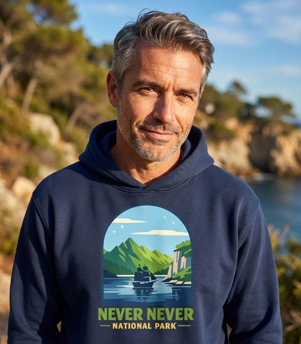 "Never Never National Park" is a creative twist on J.M. Barrie's iconic Neverland, a timeless place of adventure and perpetual youth. The phrase suggests an uncharted territory filled with wonder, where forgotten paths and hidden lagoons await discovery. It speaks to the inner child and the desire for escape into a fantastical world.