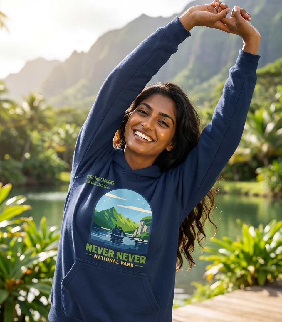 This design captures the adventurous spirit of travelers exploring the whimsical lagoons and lost trails of a fantastical national park.