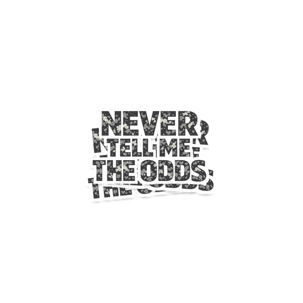 This graphic features the famous and inspiring quote, "Never Tell Me The Odds," presented in a bold, distressed font. The textured, camo-like appearance gives the text a rugged and resilient feel, perfectly matching the quote's rebellious sentiment.